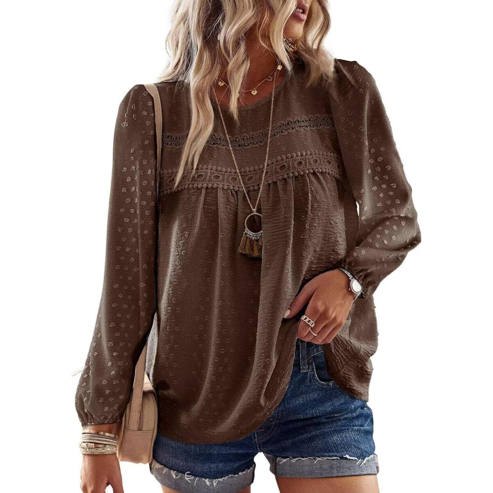 Boho Tops for Women Long Sleeve Shirts Crewneck Flowy Womens Blouses Dressy Casual Lace Hem Clothing Trendy 2026(Brown)