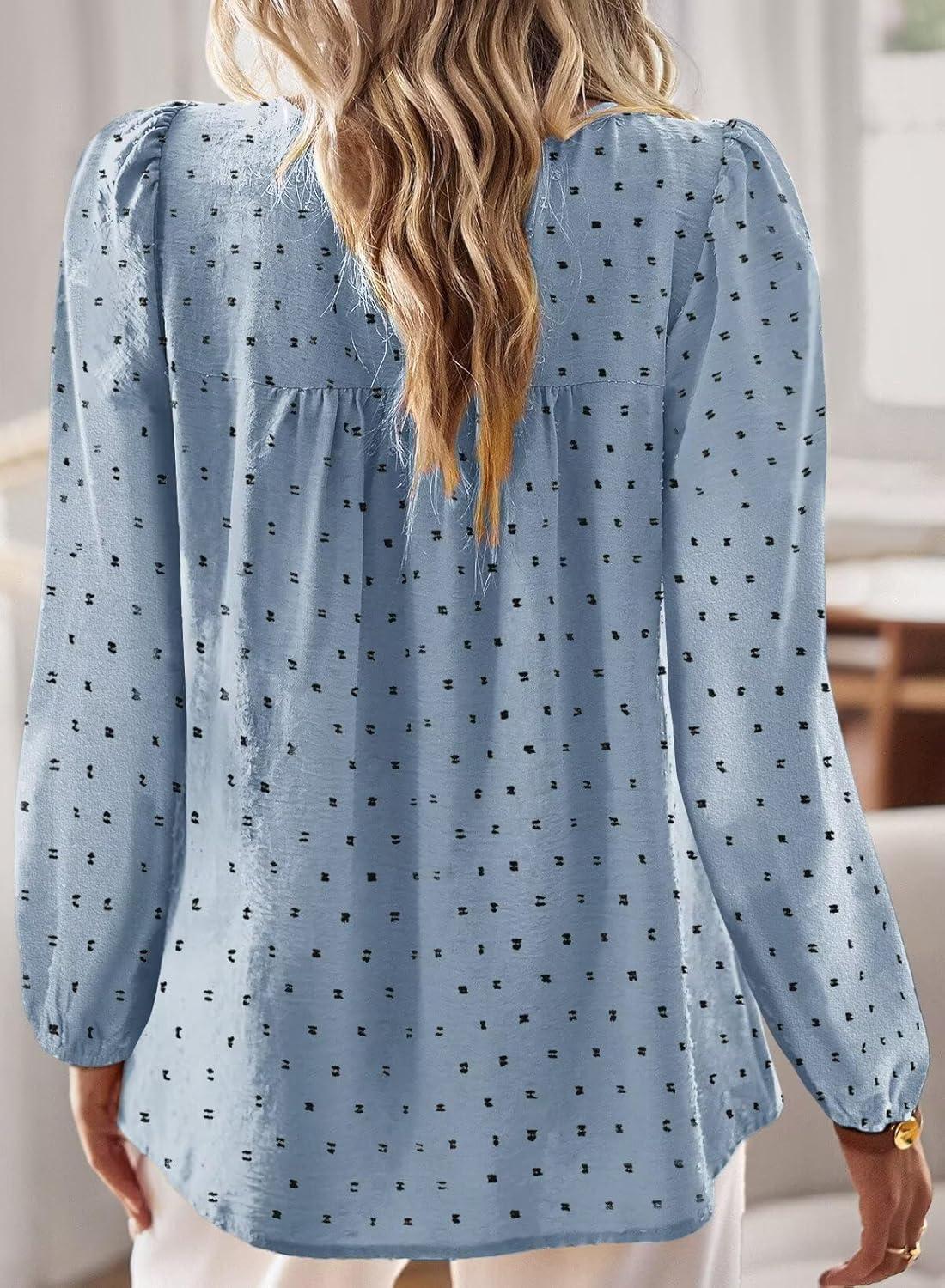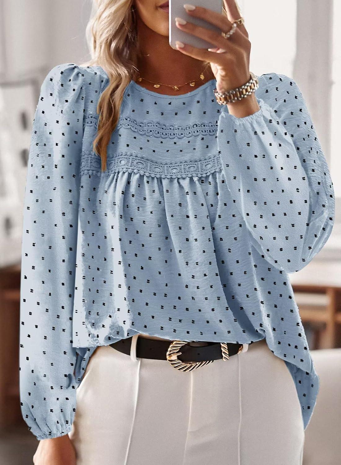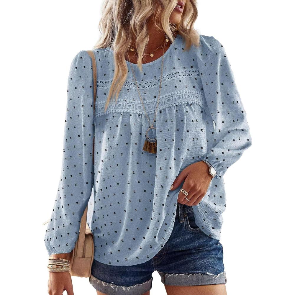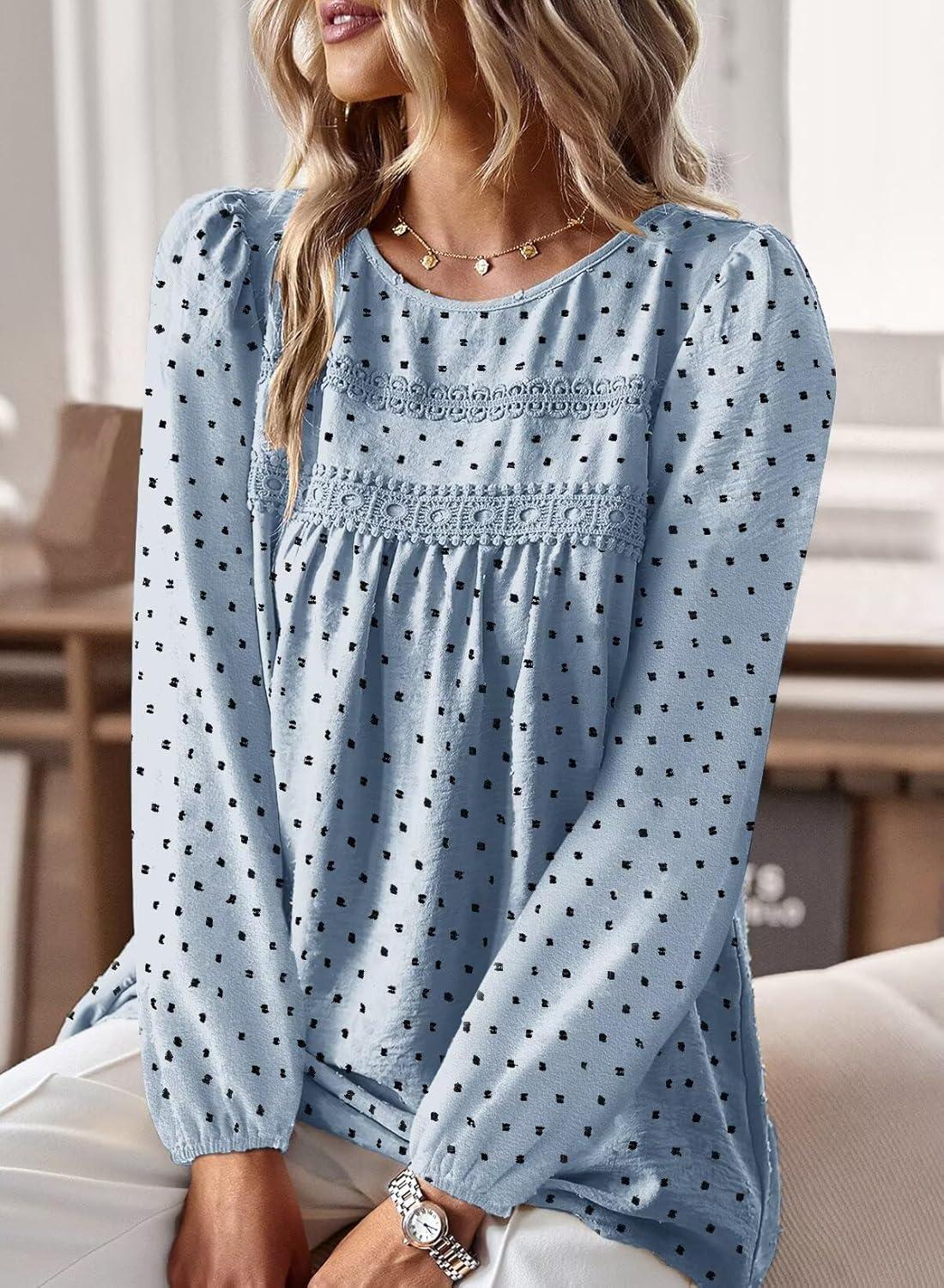Boho Tops for Women Long Sleeve Shirts Crewneck Flowy Womens Blouses Dressy Casual Lace Hem Clothing Trendy 2026(Light Blue-black Dots)