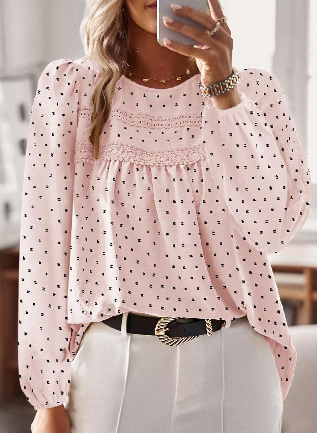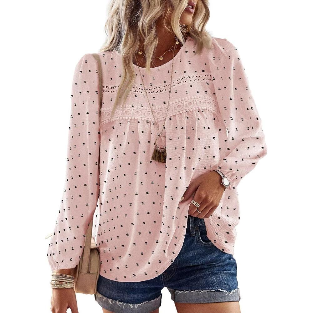 Boho Tops for Women Long Sleeve Shirts Crewneck Flowy Womens Blouses Dressy Casual Lace Hem Clothing Trendy 2026(Pink-black Dots)