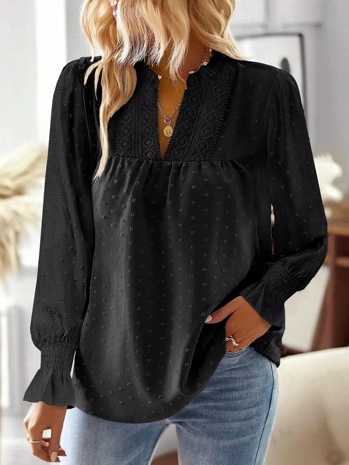 Boho Tops for Women V Neck Blouses Flowy Swiss Dot Dressy Casual Lace Womens Long Sleeve Shirts Trendy 2026(Black)