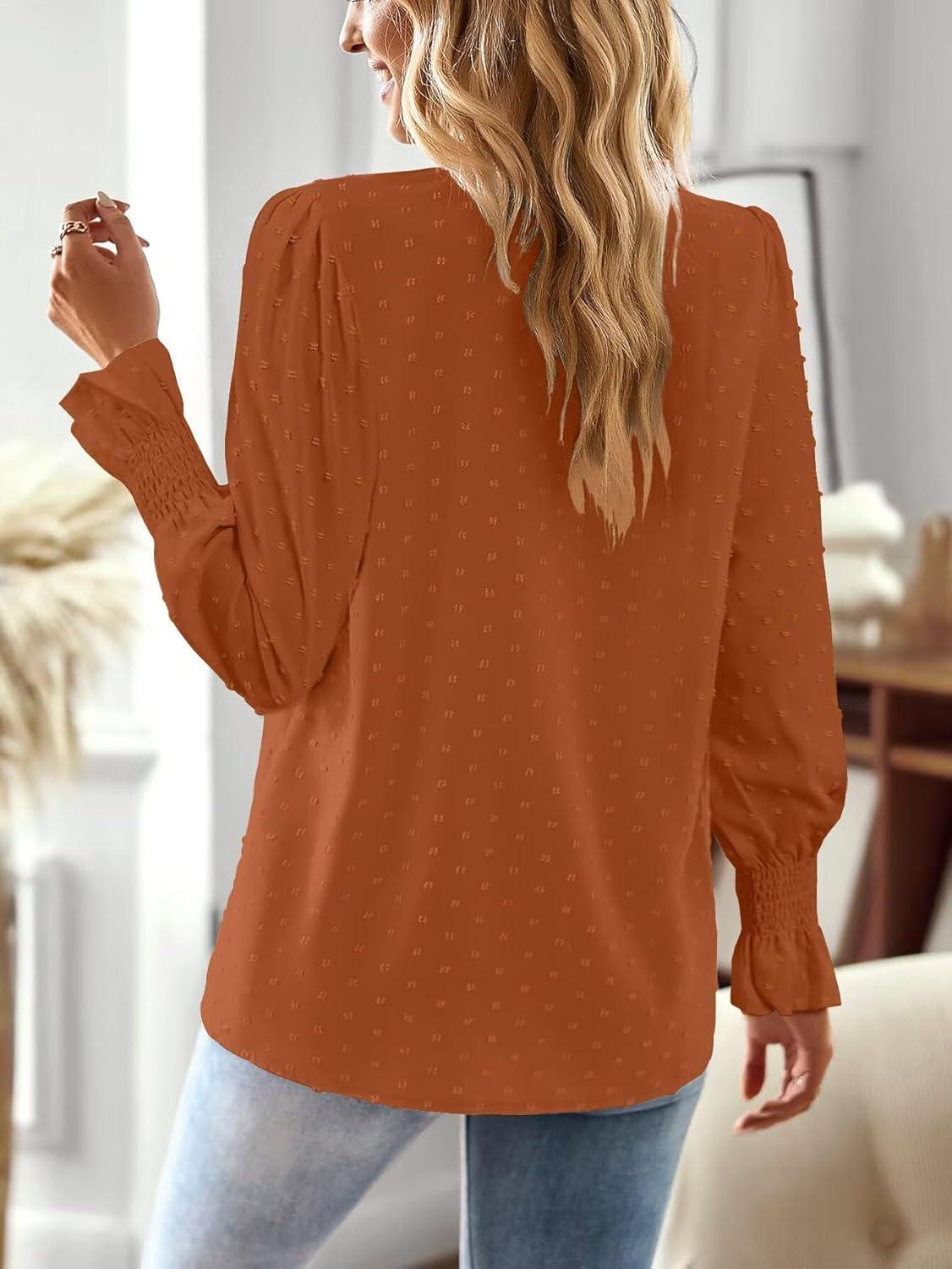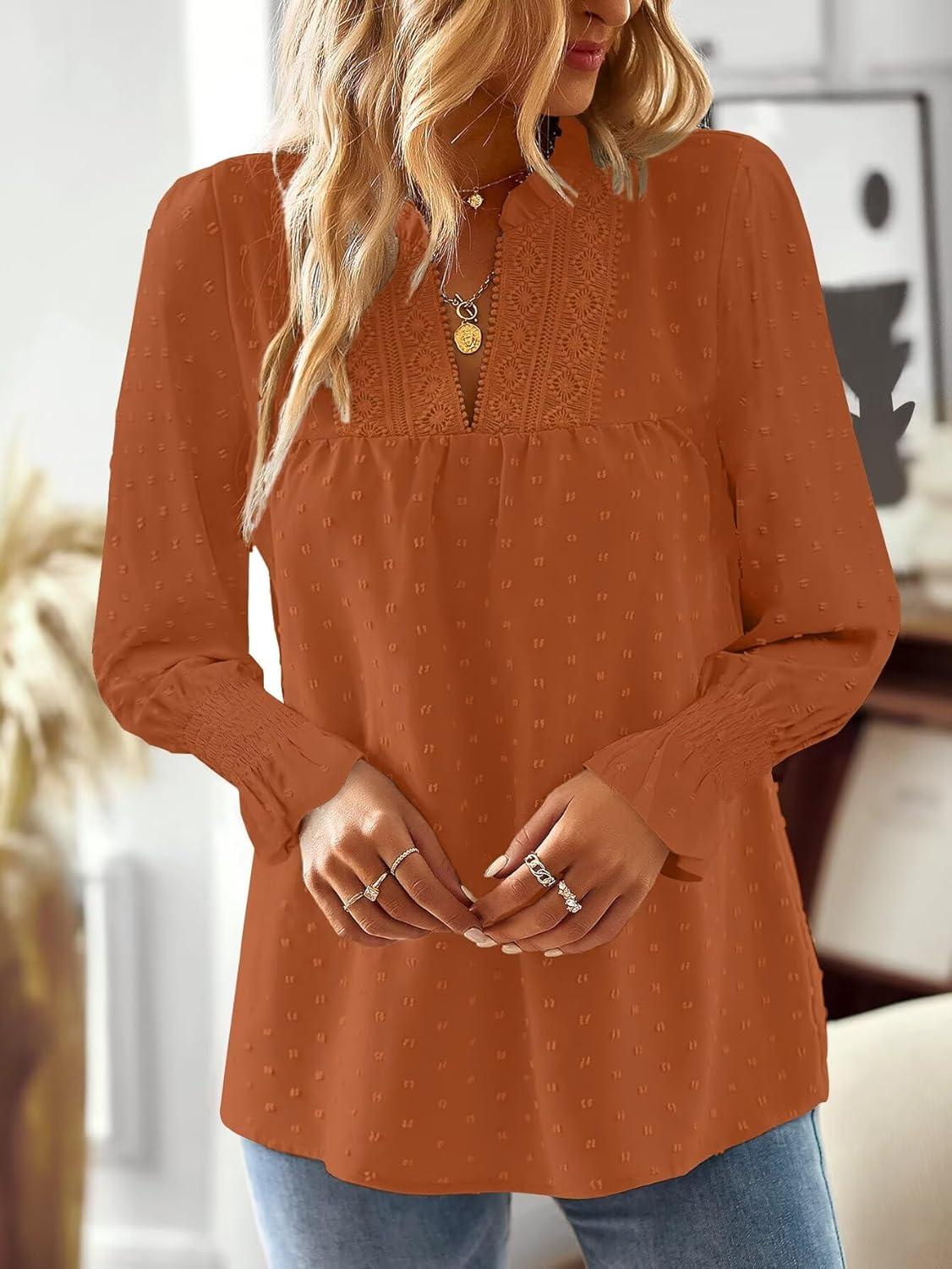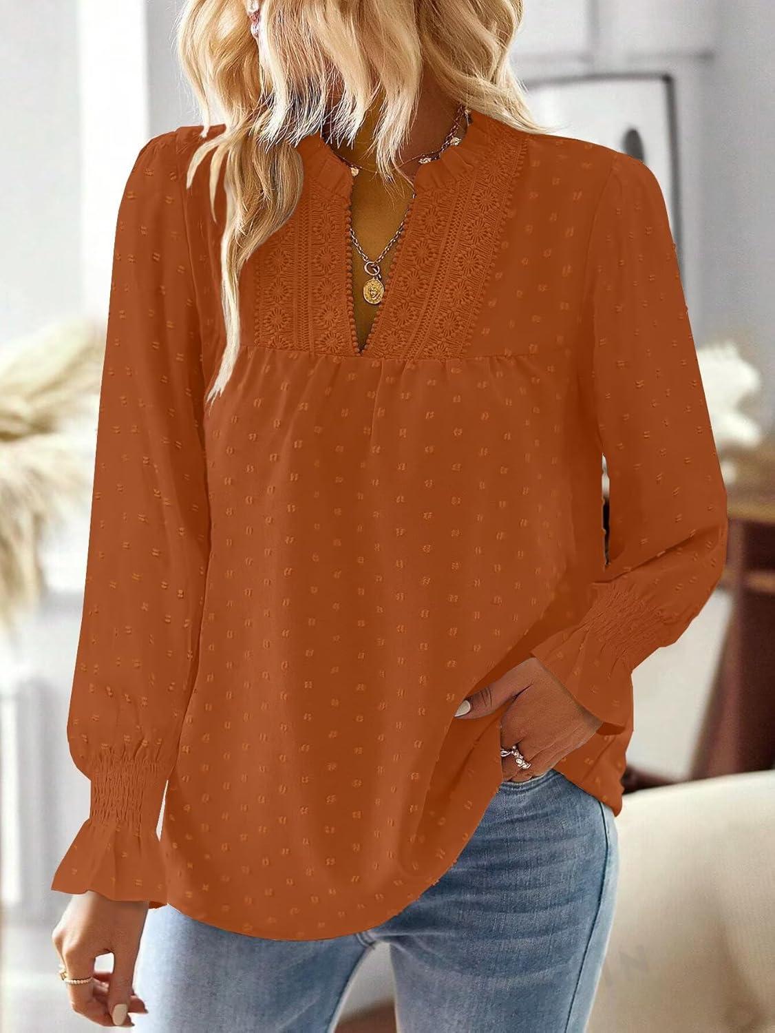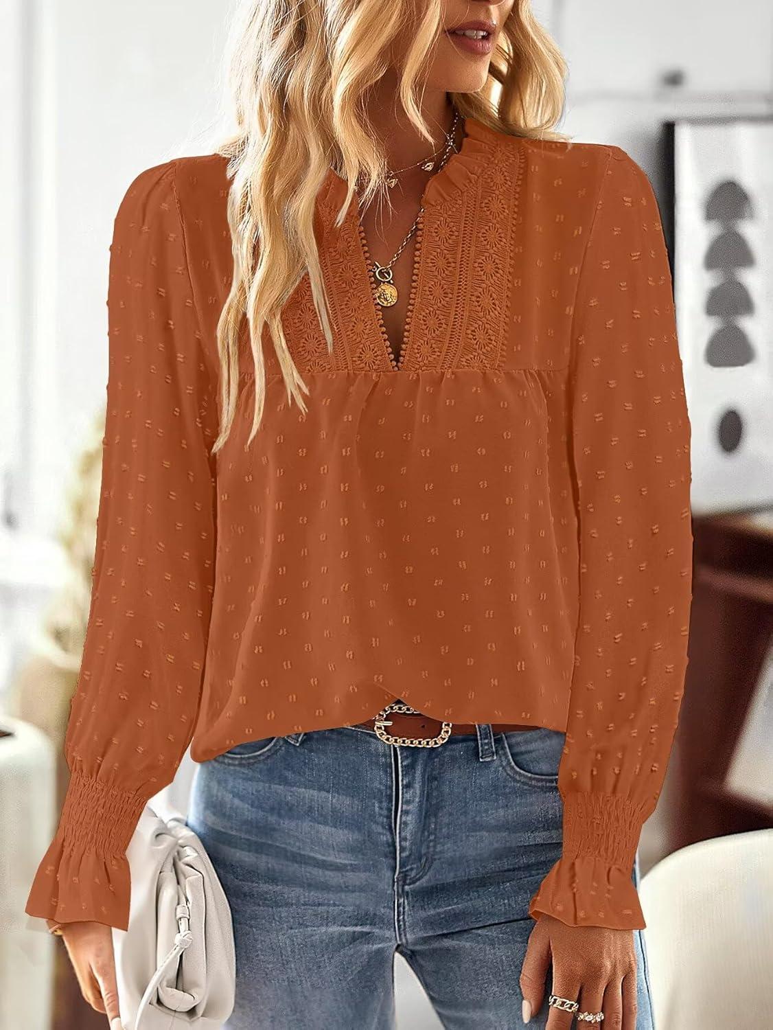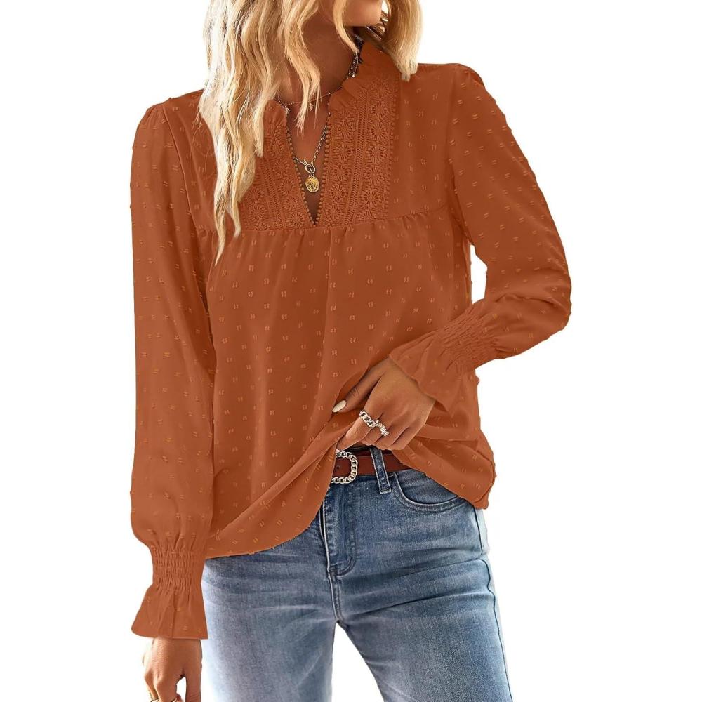 Boho Tops for Women V Neck Blouses Flowy Swiss Dot Dressy Casual Lace Womens Long Sleeve Shirts Trendy 2026(Caramel)
