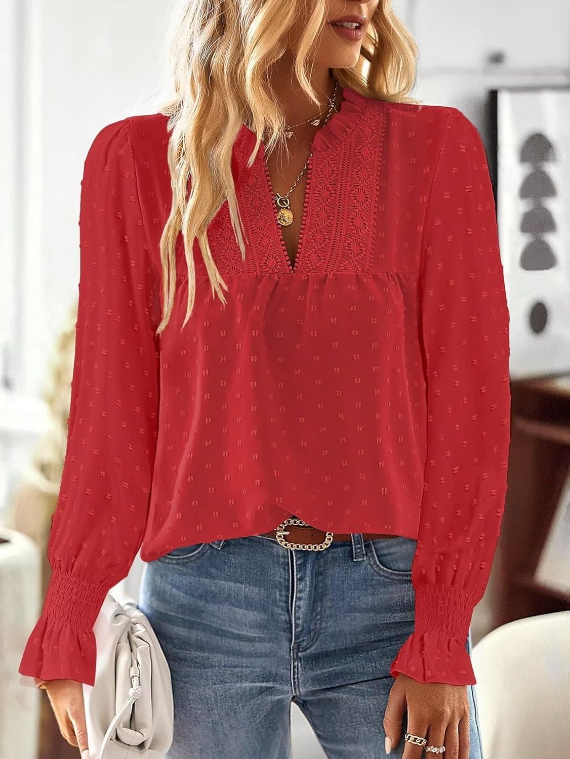 Boho Tops for Women V Neck Blouses Flowy Swiss Dot Dressy Casual Lace Womens Long Sleeve Shirts Trendy 2026(Red)