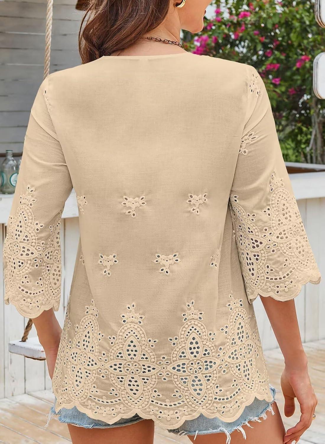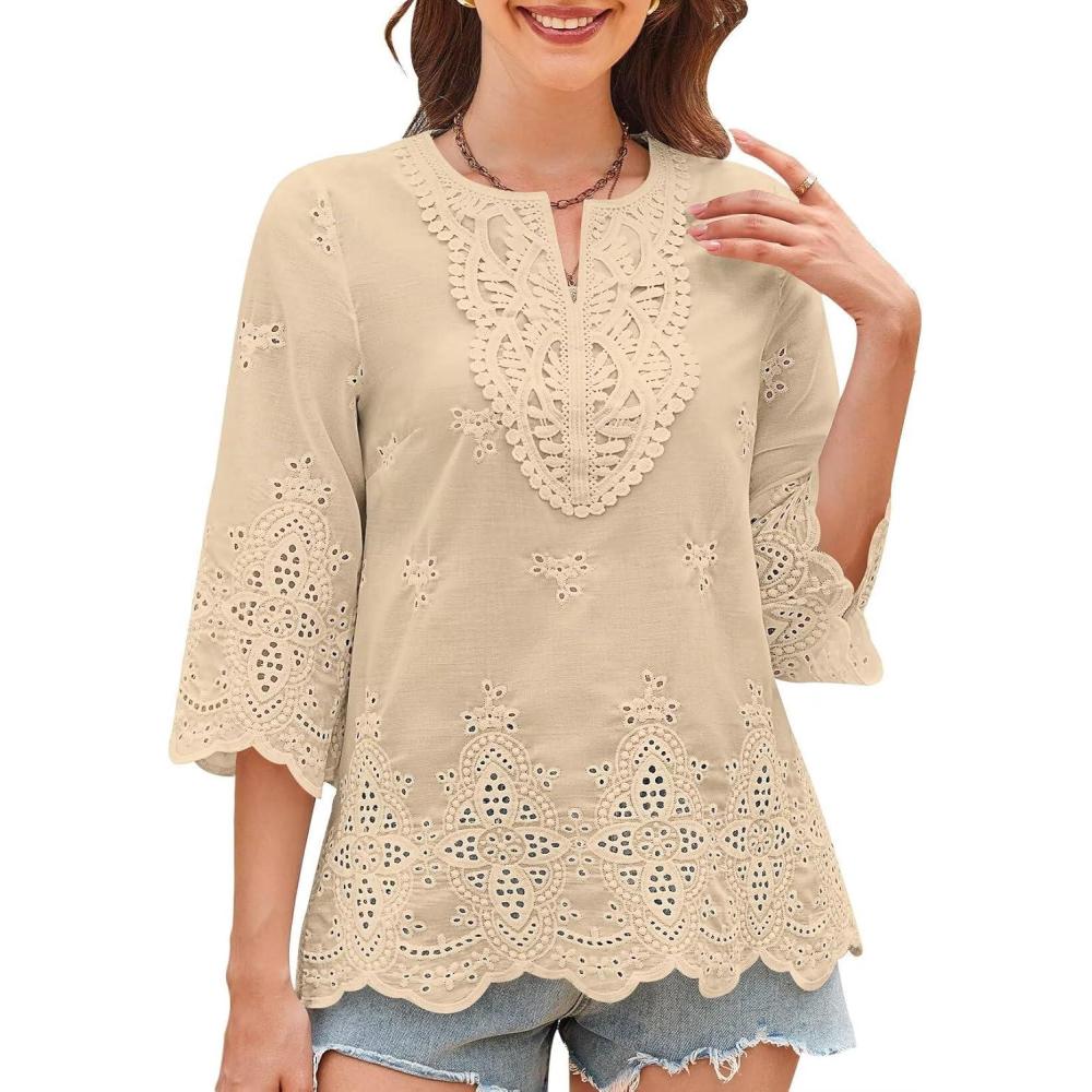 Falechay Womens Tops 3/4 Length Sleeve Eyelet Blouse Peasant Flowy Boho Top Hollow Out Embroidered Notch V Neck Shirts(Apricot)