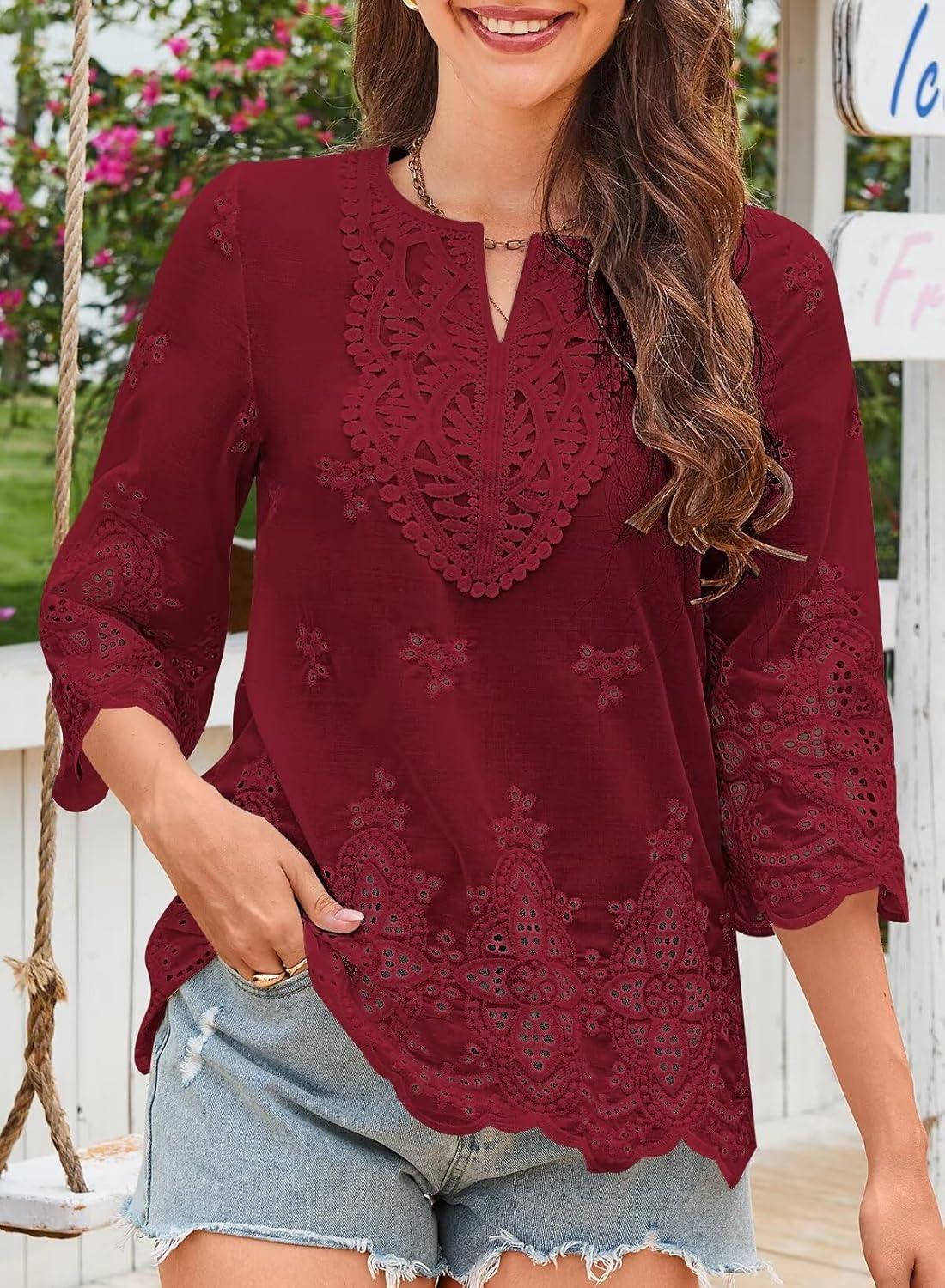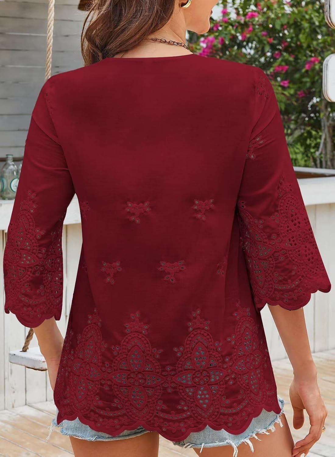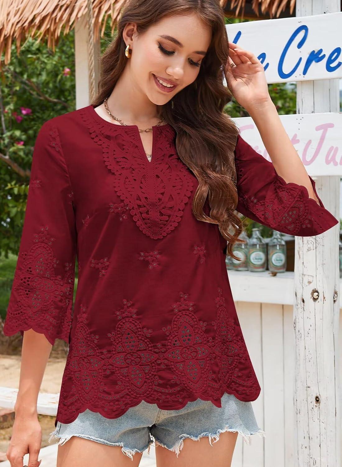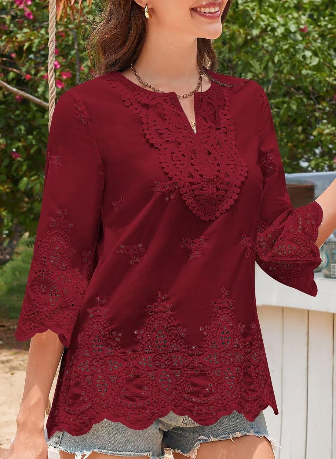 Falechay Womens Tops 3/4 Length Sleeve Eyelet Blouse Peasant Flowy Boho Top Hollow Out Embroidered Notch V Neck Shirts(Red)