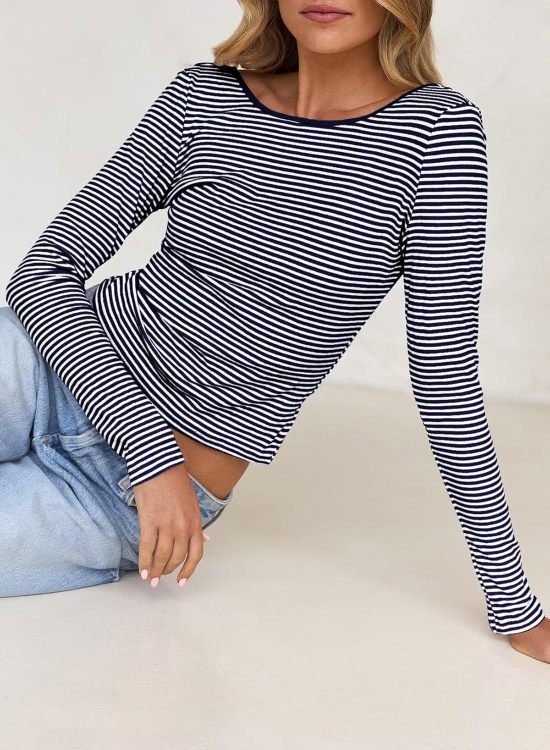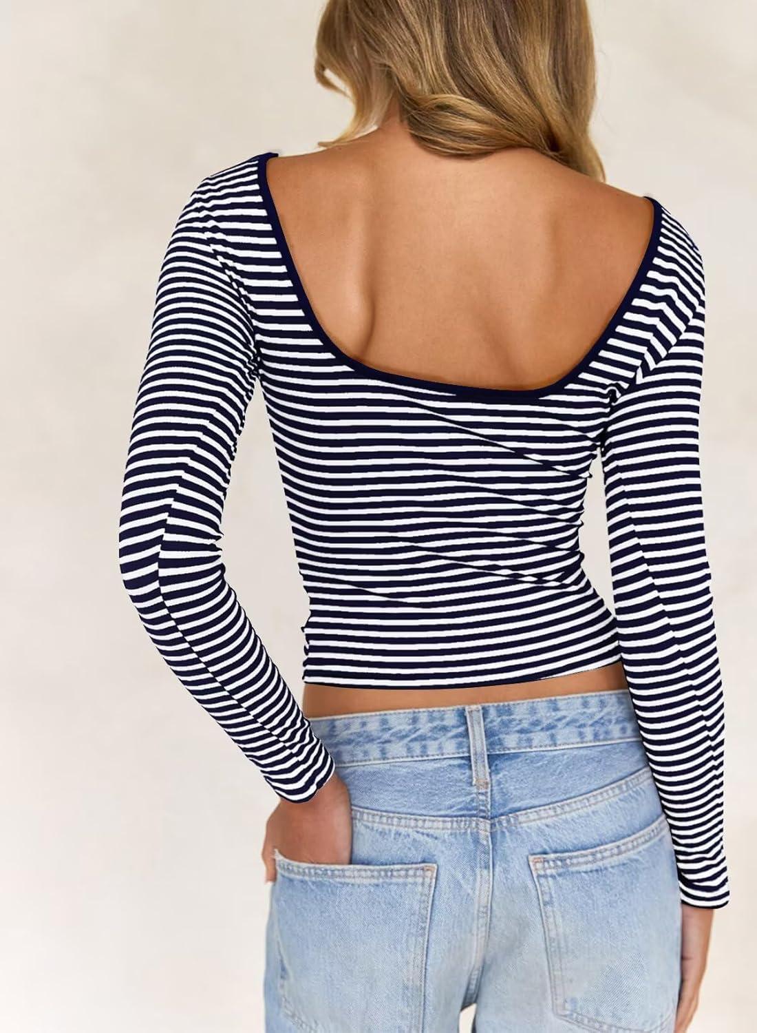 Long Sleeve Shirts for Women Sexy Backless Striped Tops Going Out T-Shirt Y2K Crop Womens Blouse Boat Neck Outfit(Blue)