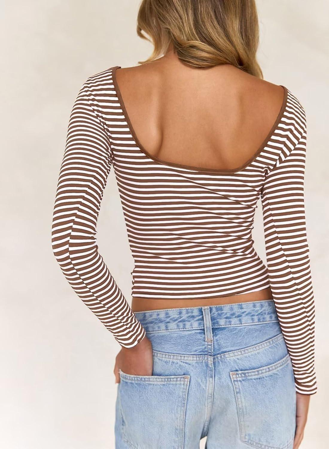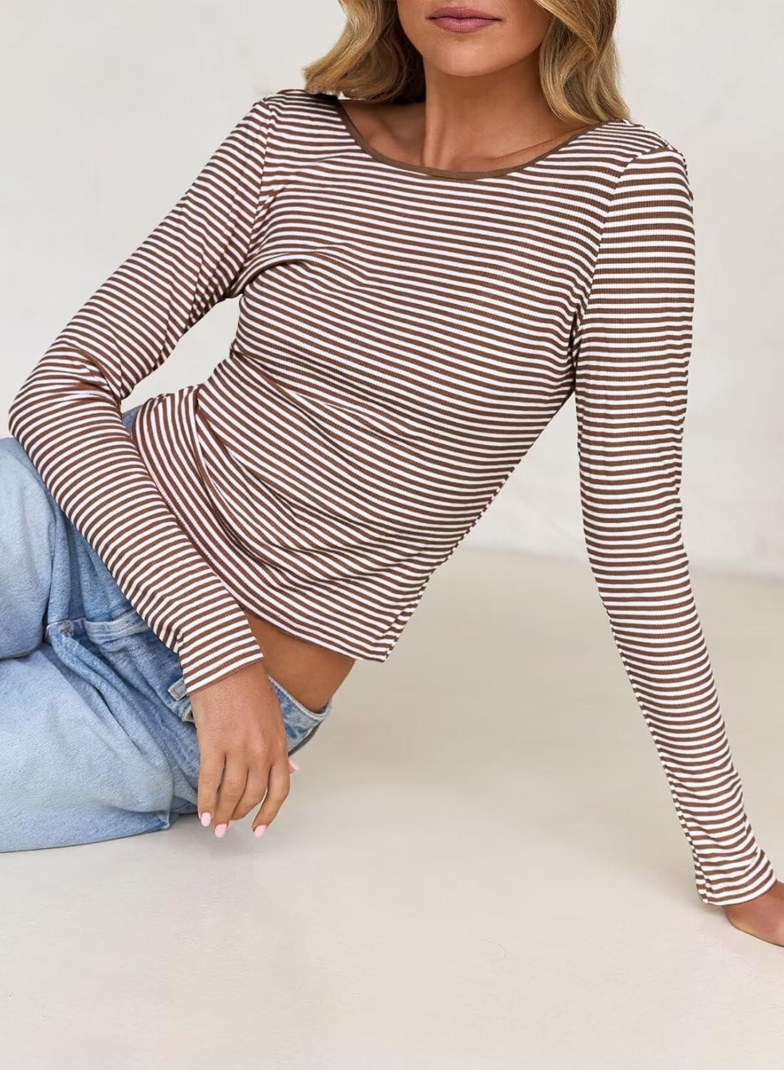 Long Sleeve Shirts for Women Sexy Backless Striped Tops Going Out T-Shirt Y2K Crop Womens Blouse Boat Neck Outfit(Camel and White)