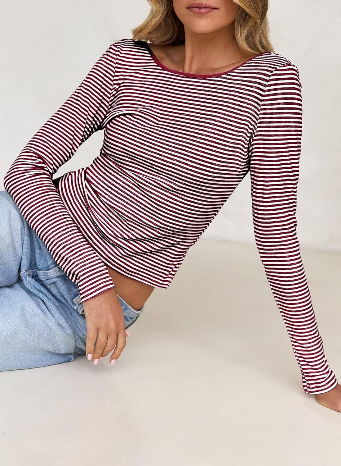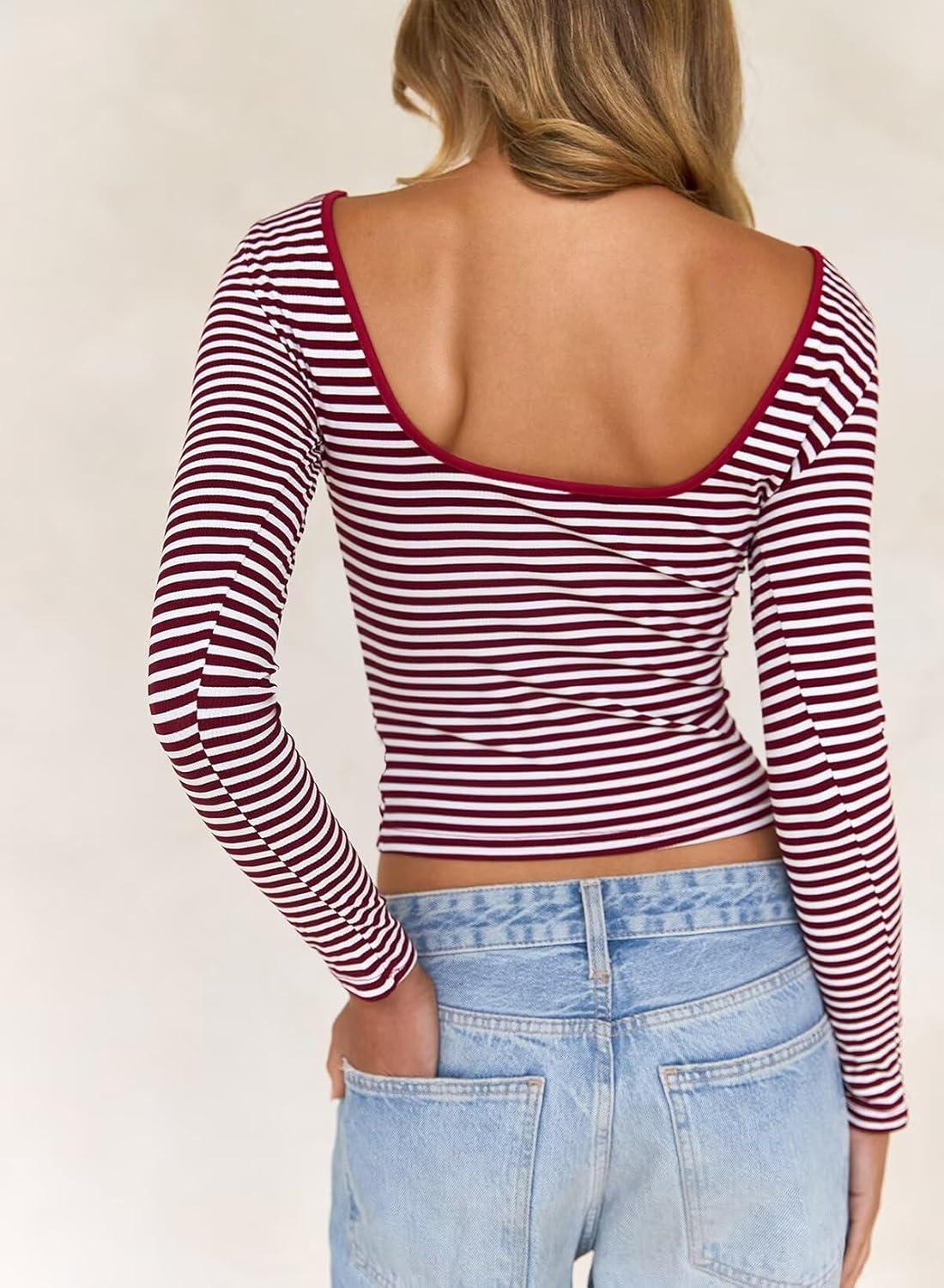Long Sleeve Shirts for Women Sexy Backless Striped Tops Going Out T-Shirt Y2K Crop Womens Blouse Boat Neck Outfit(Red)