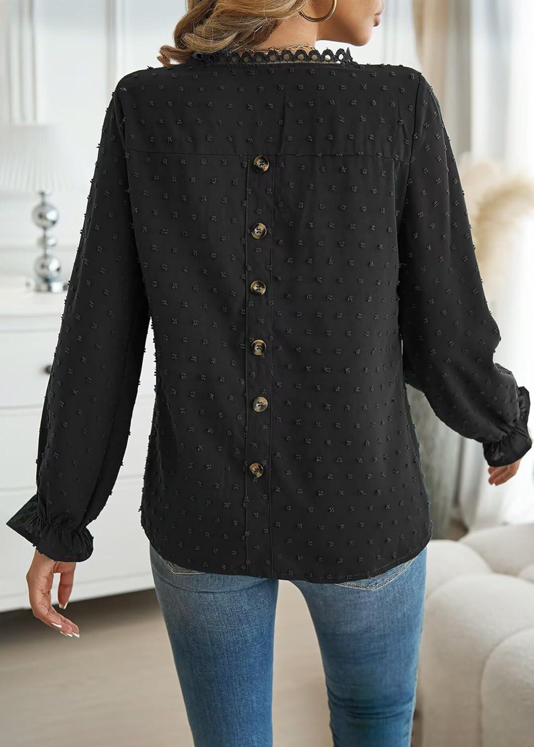 Womens Boho Tops Long Sleeve Shirts For Women Cute Crewneck Blouse Dressy Casual Swiss Dot Crochet Hollow Top 2025(Black)