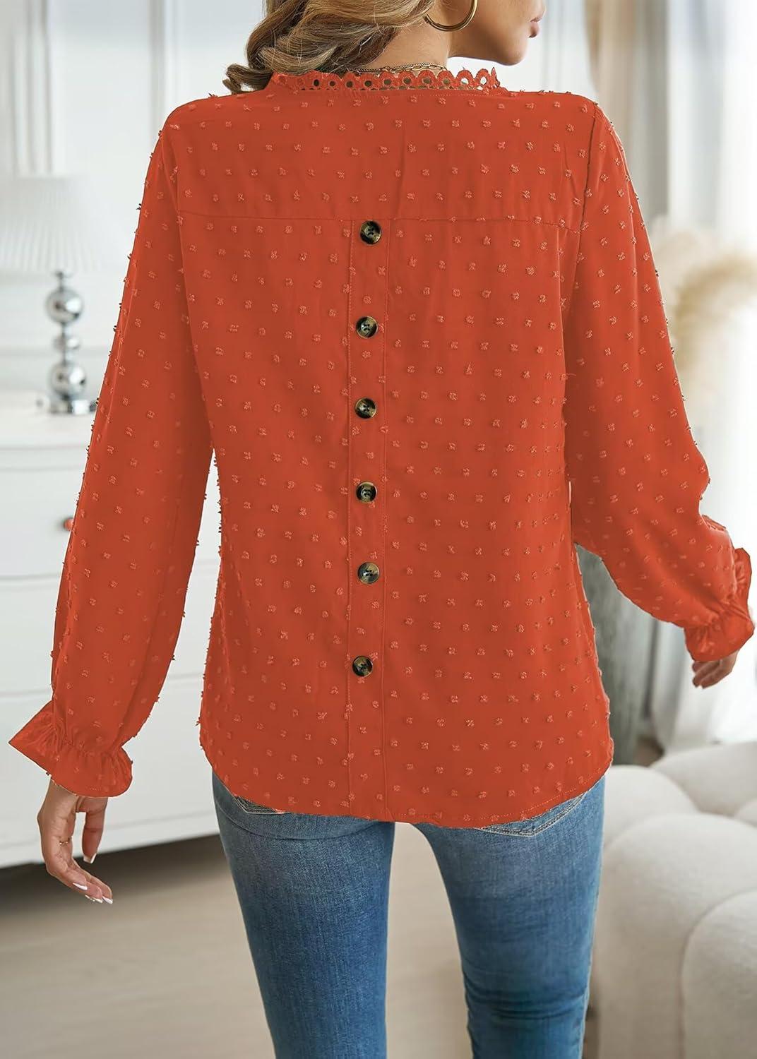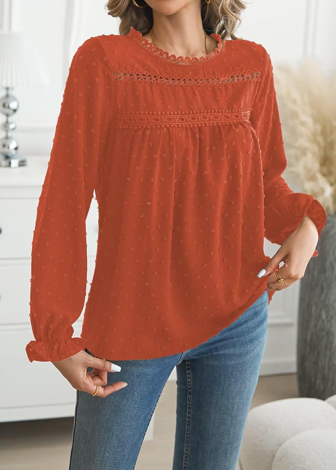 Womens Boho Tops Long Sleeve Shirts For Women Cute Crewneck Blouse Dressy Casual Swiss Dot Crochet Hollow Top 2025(Bright Orange)