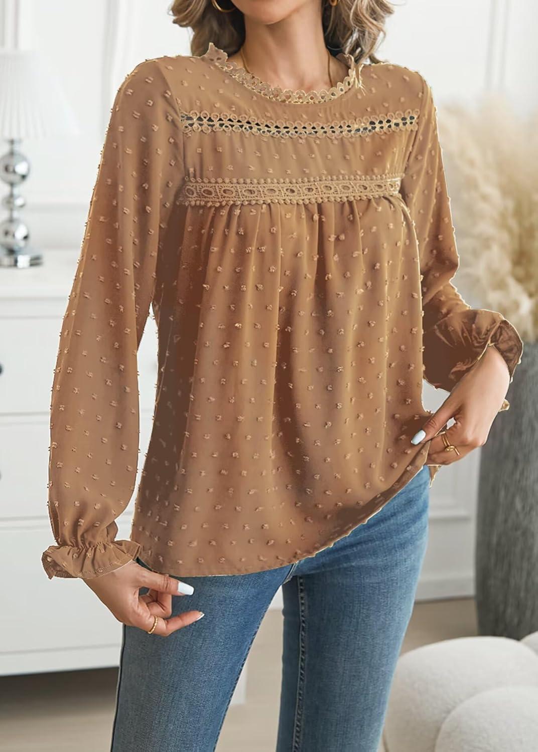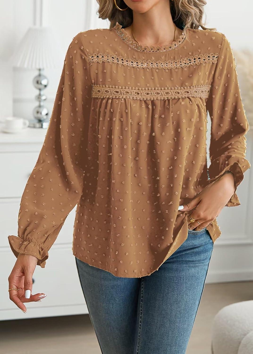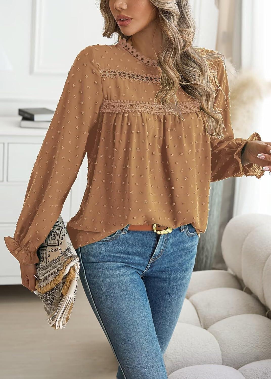 Womens Boho Tops Long Sleeve Shirts For Women Cute Crewneck Blouse Dressy Casual Swiss Dot Crochet Hollow Top 2025(Light Camel)