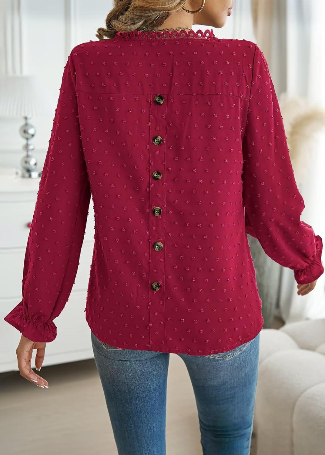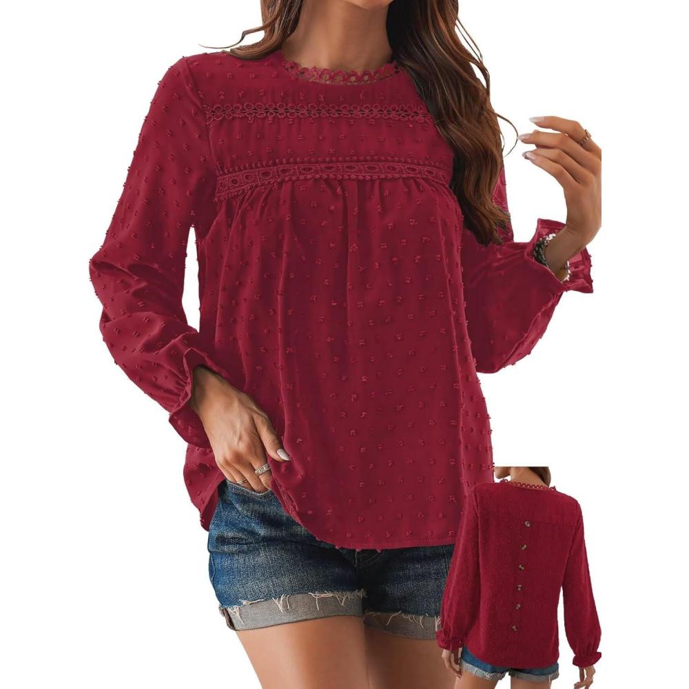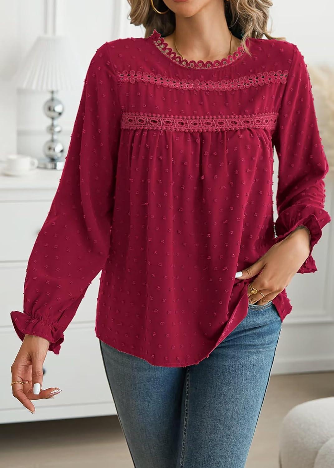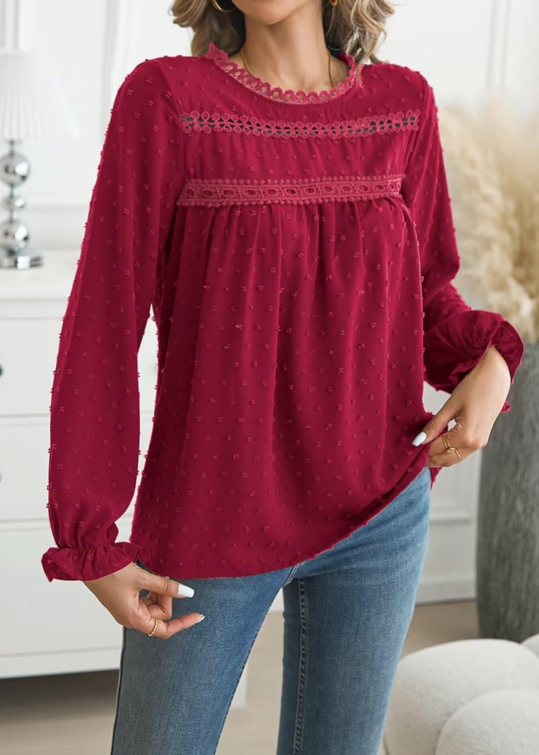 Womens Boho Tops Long Sleeve Shirts For Women Cute Crewneck Blouse Dressy Casual Swiss Dot Crochet Hollow Top 2025(Red)