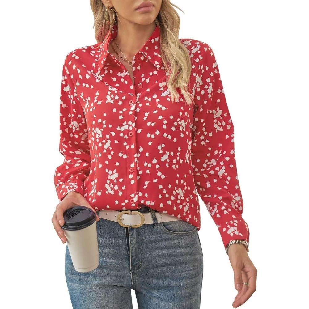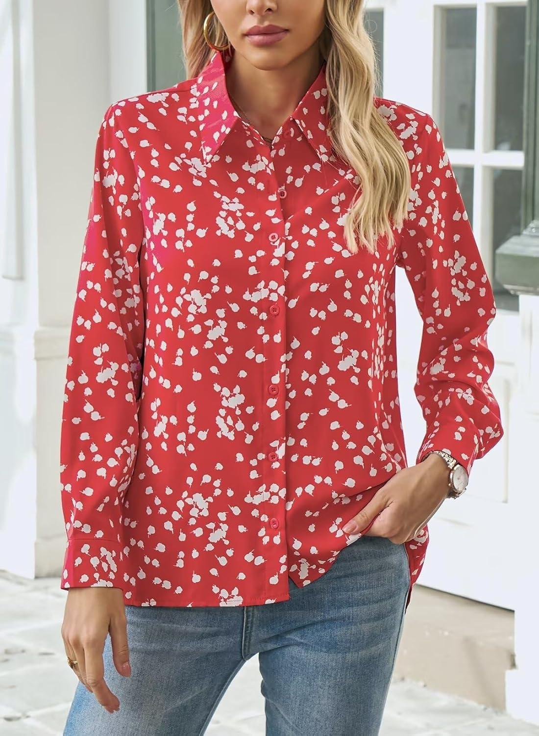 Women’s Business Casual V Neck Floral Print Long Sleeve Blouses Fashion Button Down Tops Roll Up Bohemian Shirts(Red)