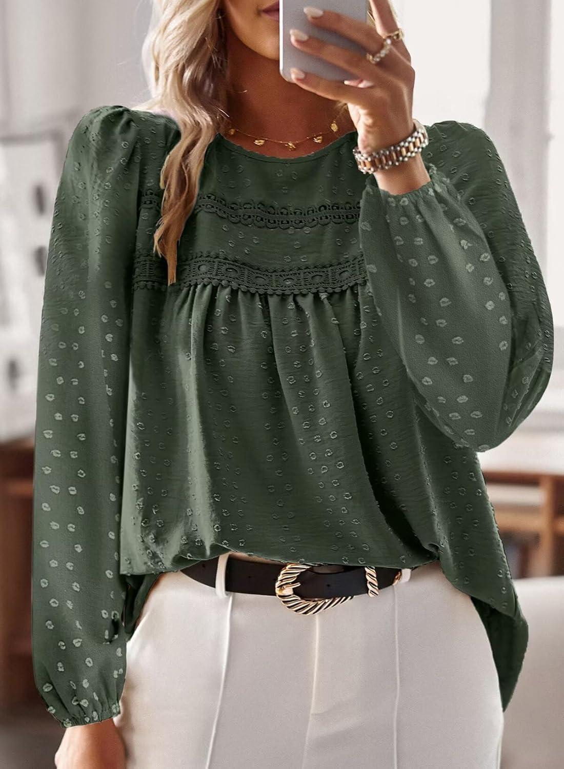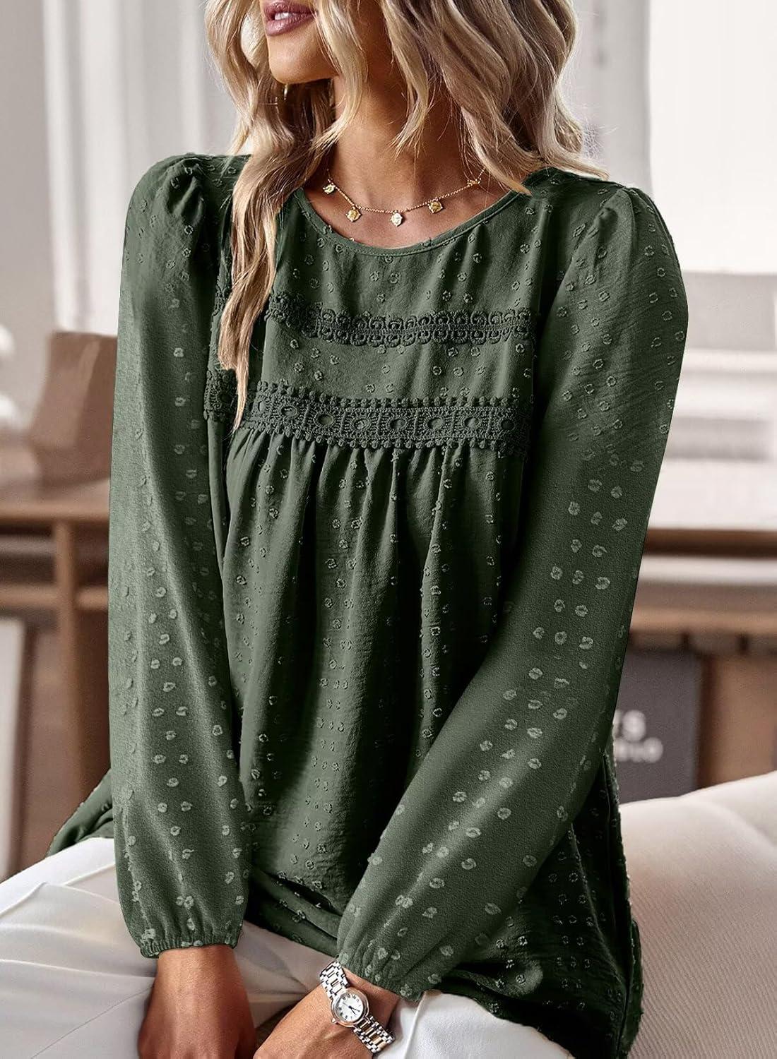 Womens Fall Tops Crewneck Long Sleeve Shirts Casual Chiffon Blouses Flowy Lace Hem Boho Clothing Trendy 2025(Green-green Dots)