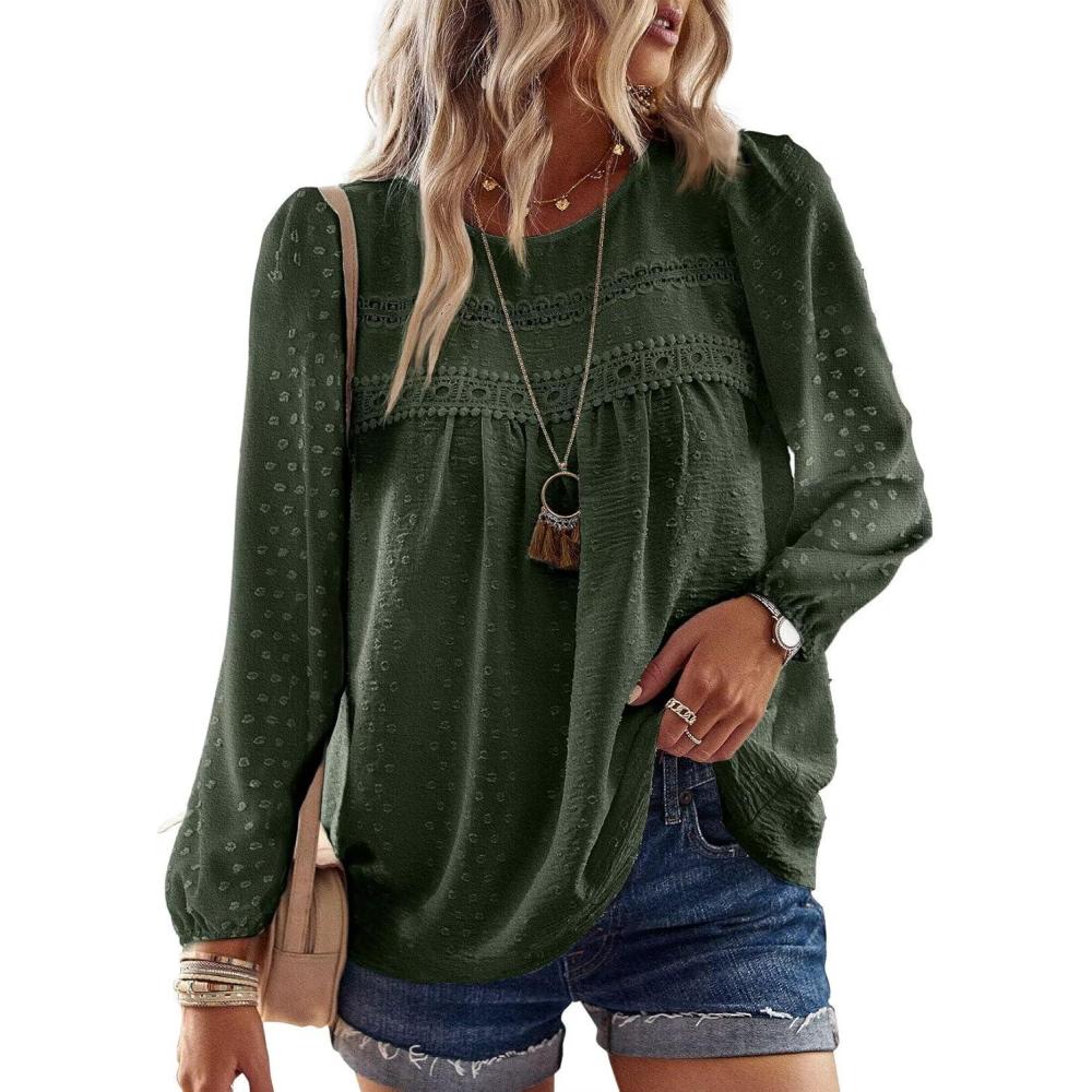 imageWomens Fall Tops Crewneck Long Sleeve Shirts Casual Chiffon Blouses Flowy Lace Hem Boho Clothing Trendy 2025Greengreen Dots