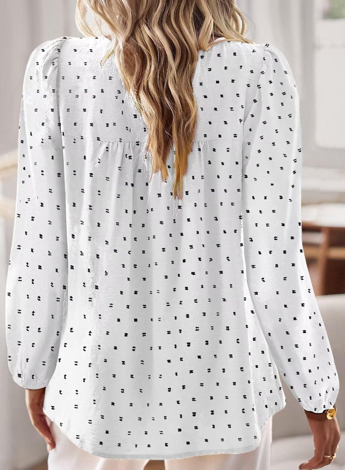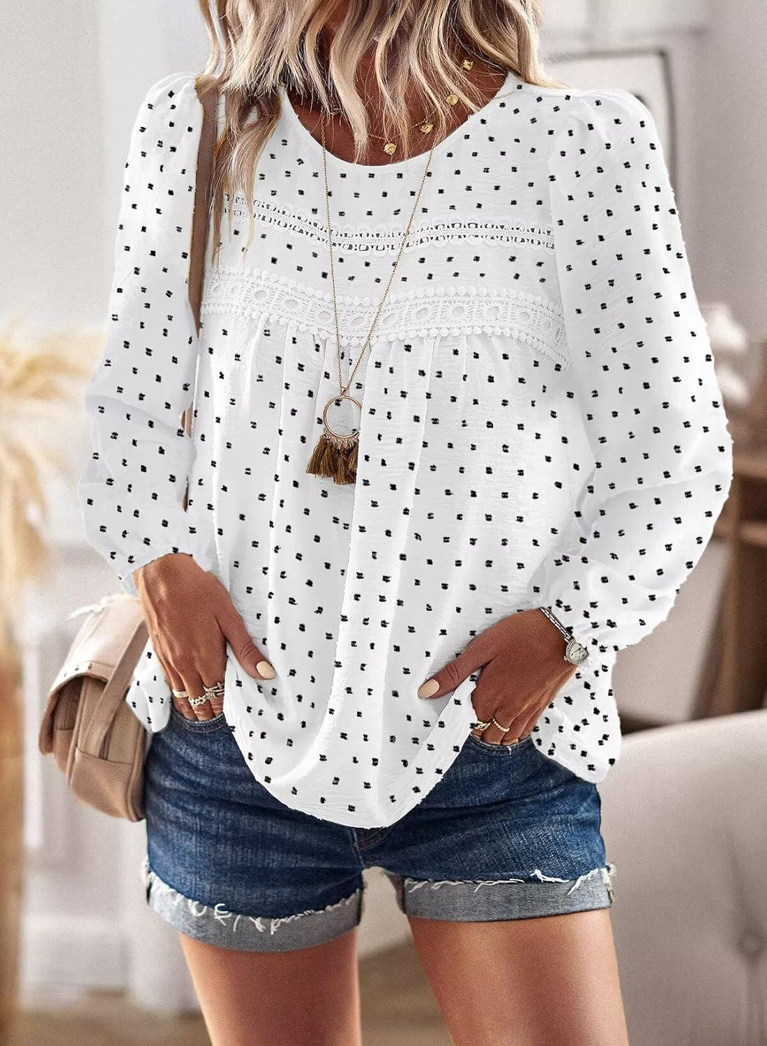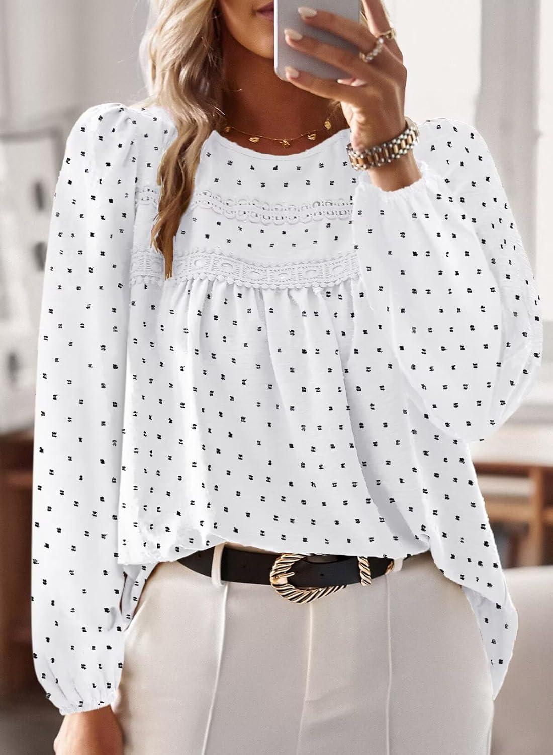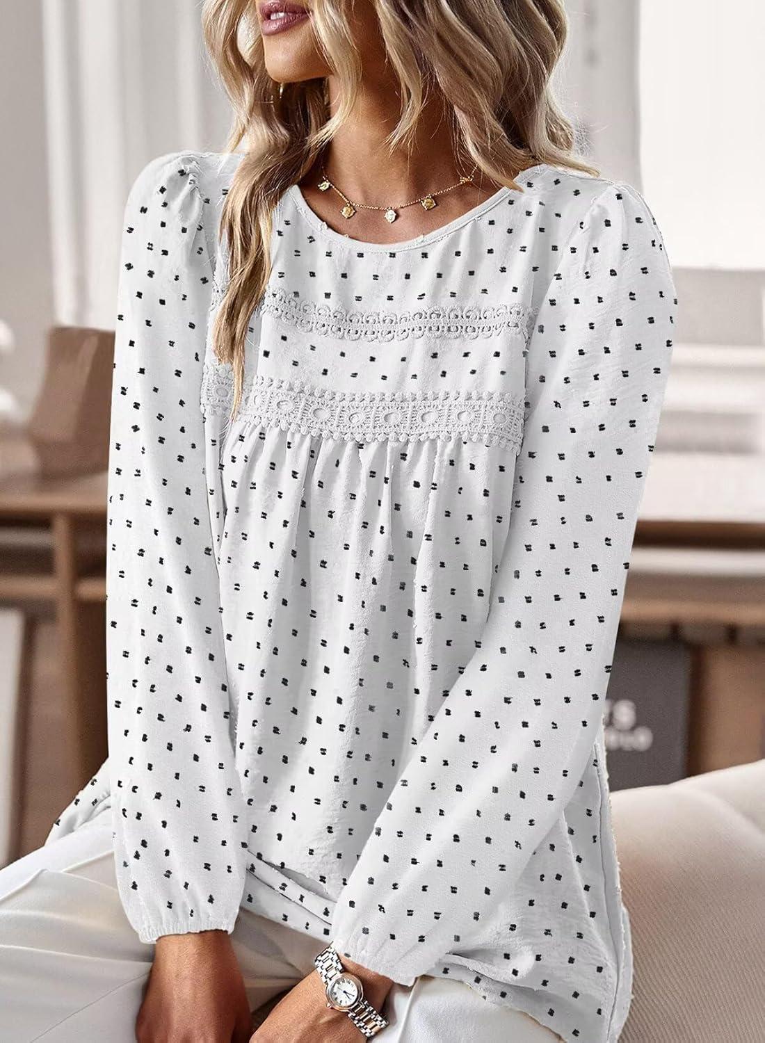 Womens Fall Tops Crewneck Long Sleeve Shirts Casual Chiffon Blouses Flowy Lace Hem Boho Clothing Trendy 2025(White-black Dots)