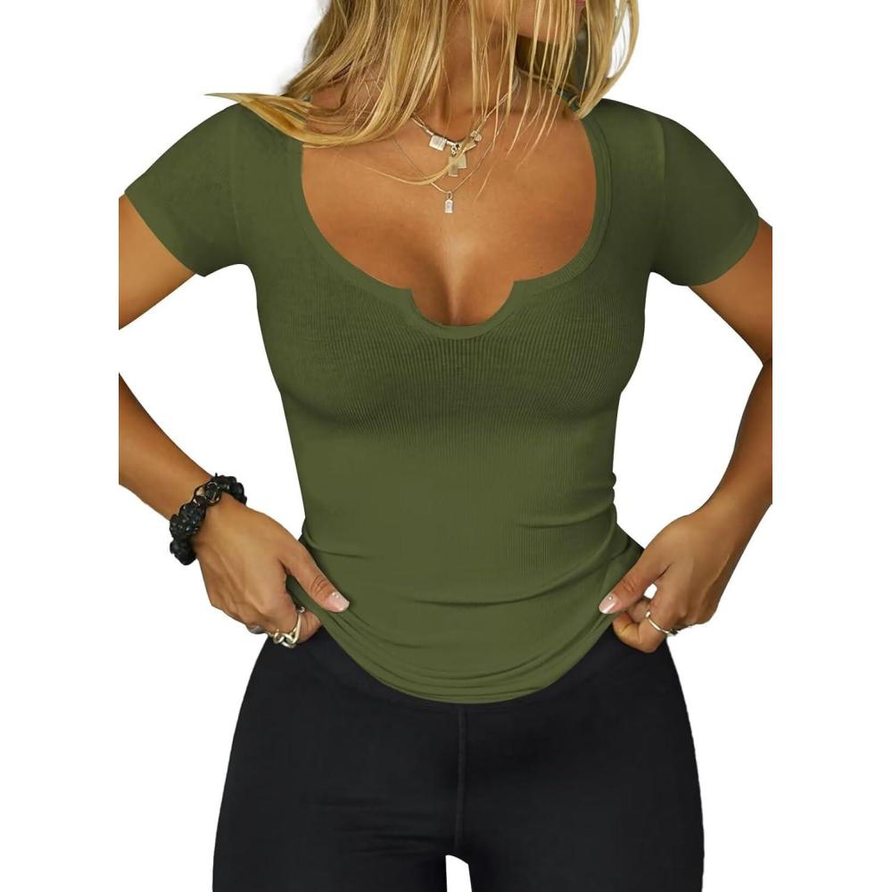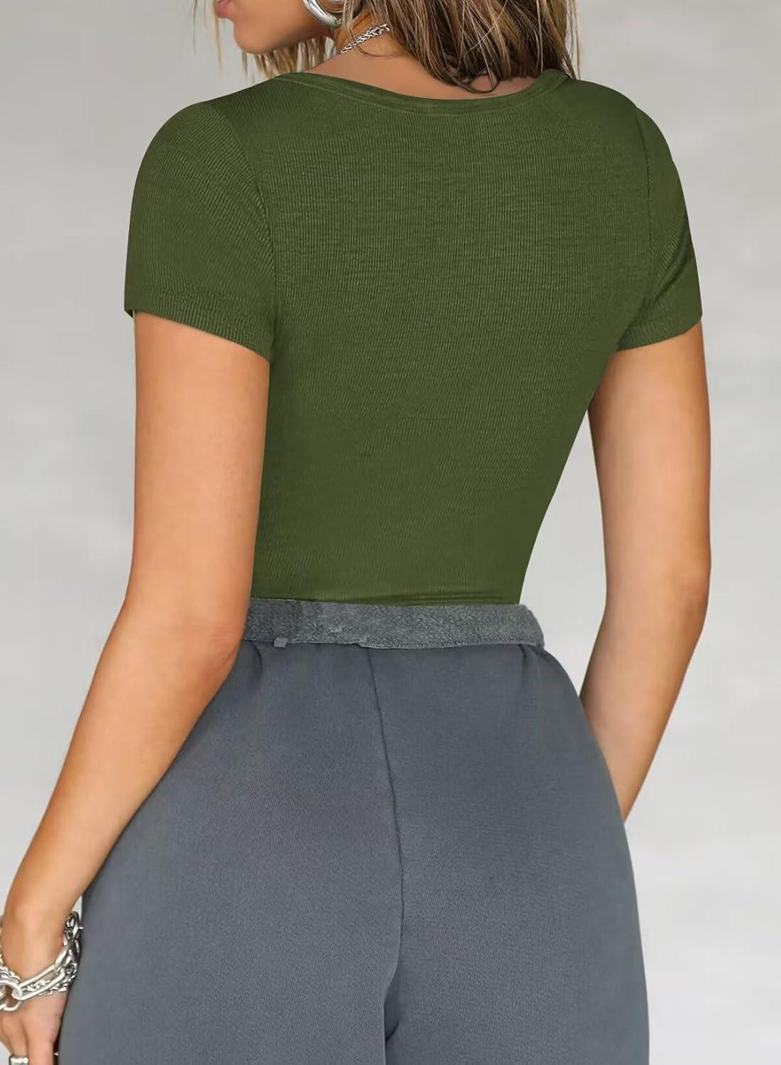Womens Going Out Short/Long Sleeve Crop Tops Sexy V Neck Shirts Ribbed Blouses for Women Y2K Tee Fitted Slim T-Shirt(A-army Green)