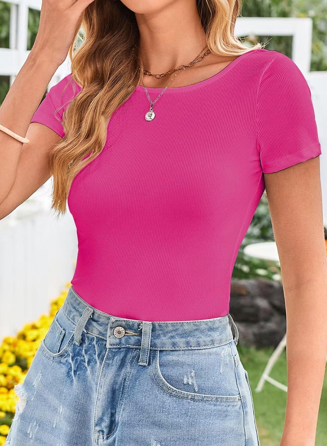 Womens Summer Short/Long Sleeve Tops Sexy Backless Striped Shirts Going Out T-Shirt Y2K Crop Blouse Boat Neck Outfit(A-solid Hot Pink)