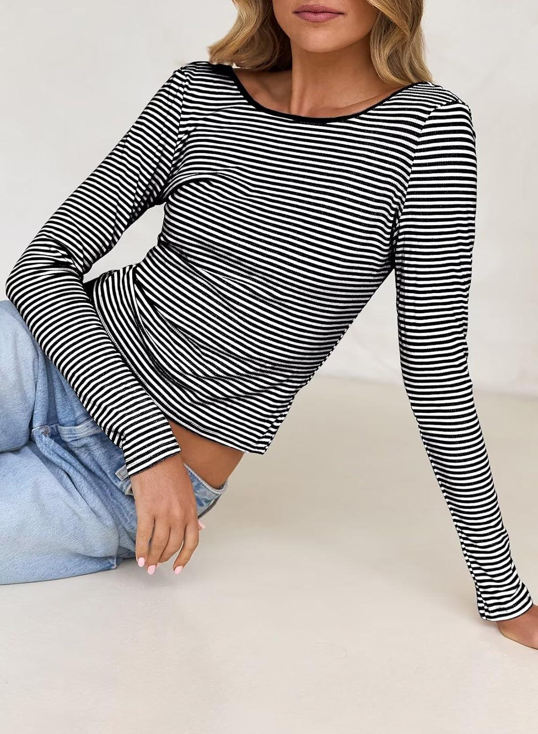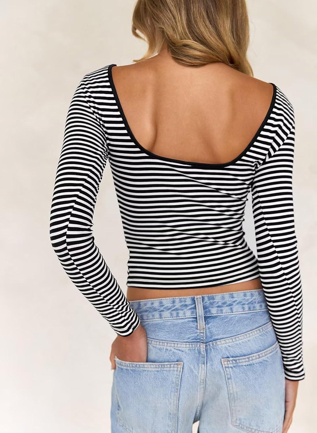 Womens Summer Short/Long Sleeve Tops Sexy Backless Striped Shirts Going Out T-Shirt Y2K Crop Blouse Boat Neck Outfit(Black)