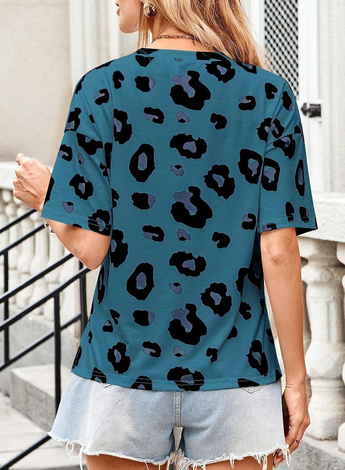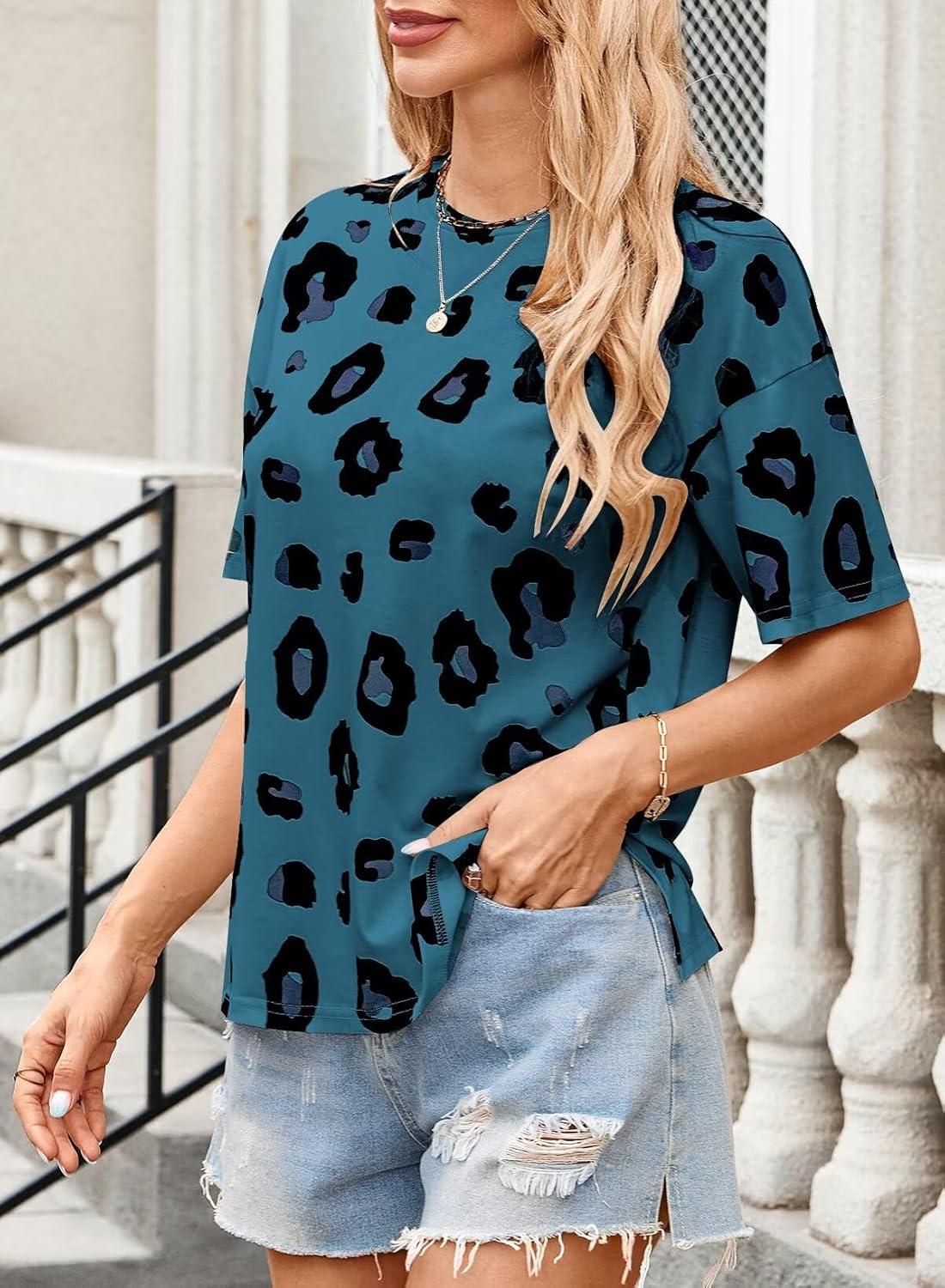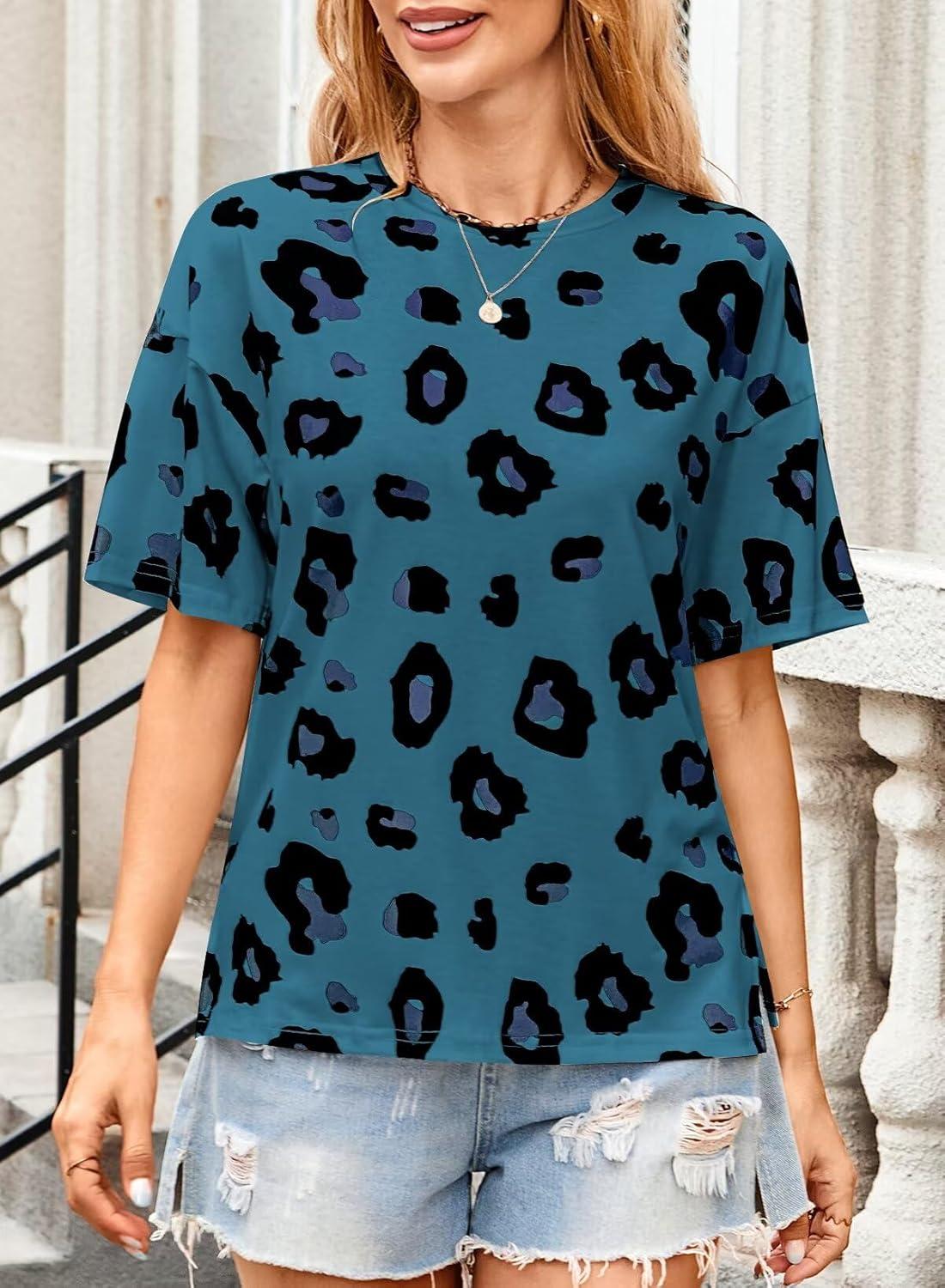Womens Summer T Shirt Leopard Print Tops for Women Trendy Crewneck Short Sleeve Tshirt Cheetah Print Top Side Split(Blue)