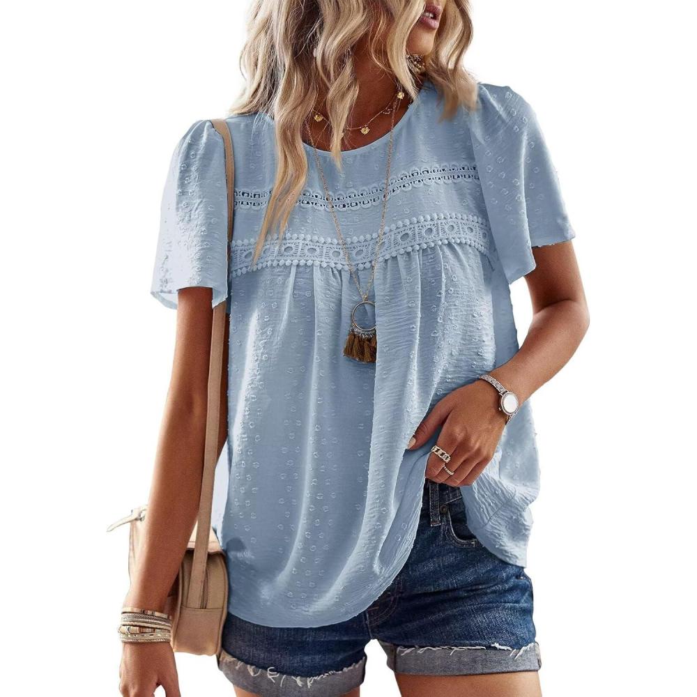 Womens Summer Tops Crewneck Short Sleeve Shirts Casual Chiffon Blouses Flowy Lace Hem Boho Clothing Trendy 2025(Blue)