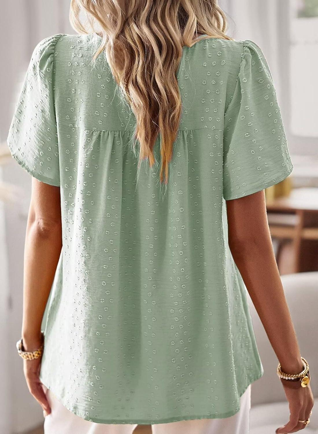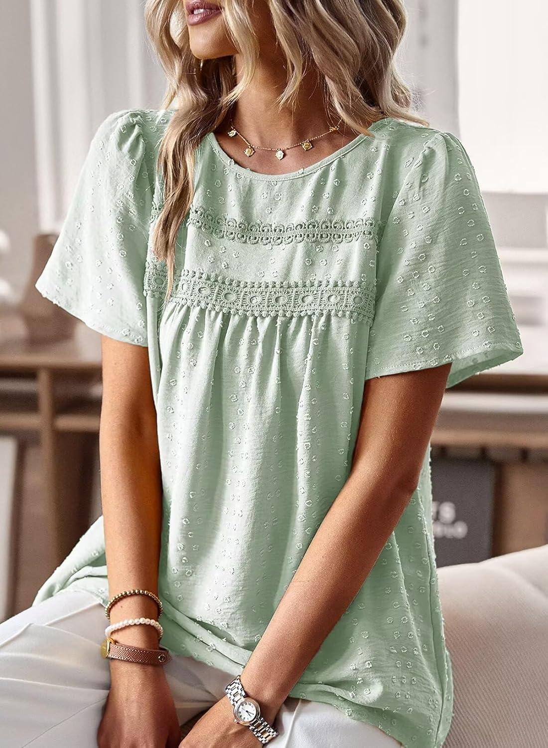 Womens Summer Tops Crewneck Short Sleeve Shirts Casual Chiffon Blouses Flowy Lace Hem Boho Clothing Trendy 2025(Light Green-black Dots)