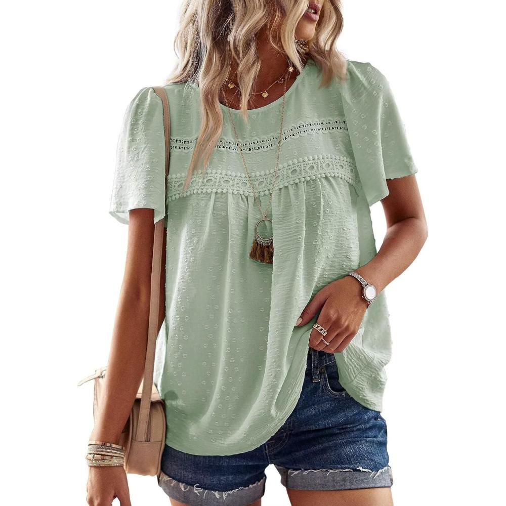 Womens Summer Tops Crewneck Short Sleeve Shirts Casual Chiffon Blouses Flowy Lace Hem Boho Clothing Trendy 2025(Light Green)