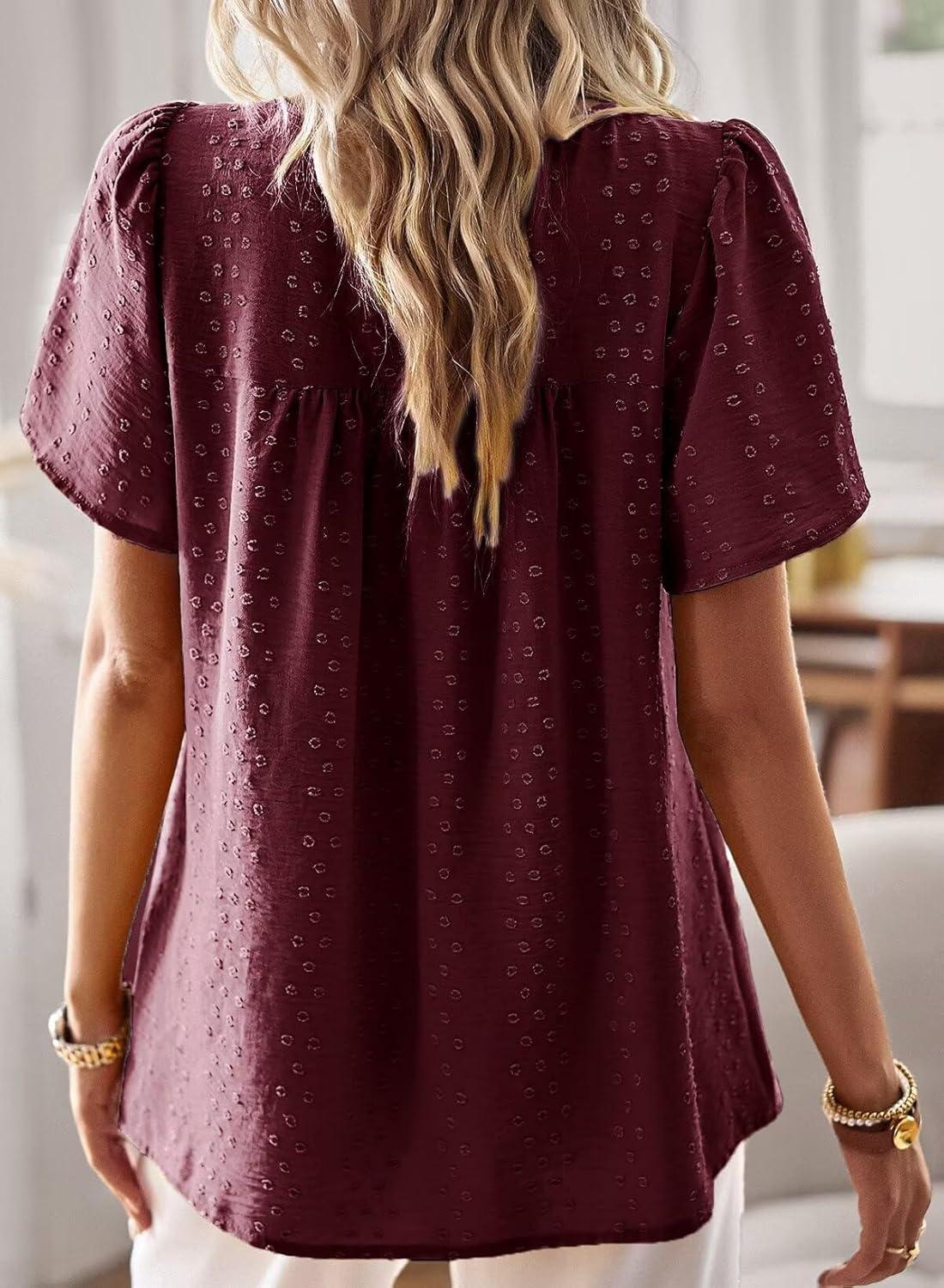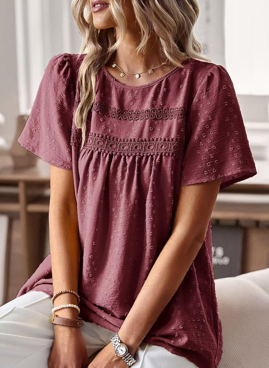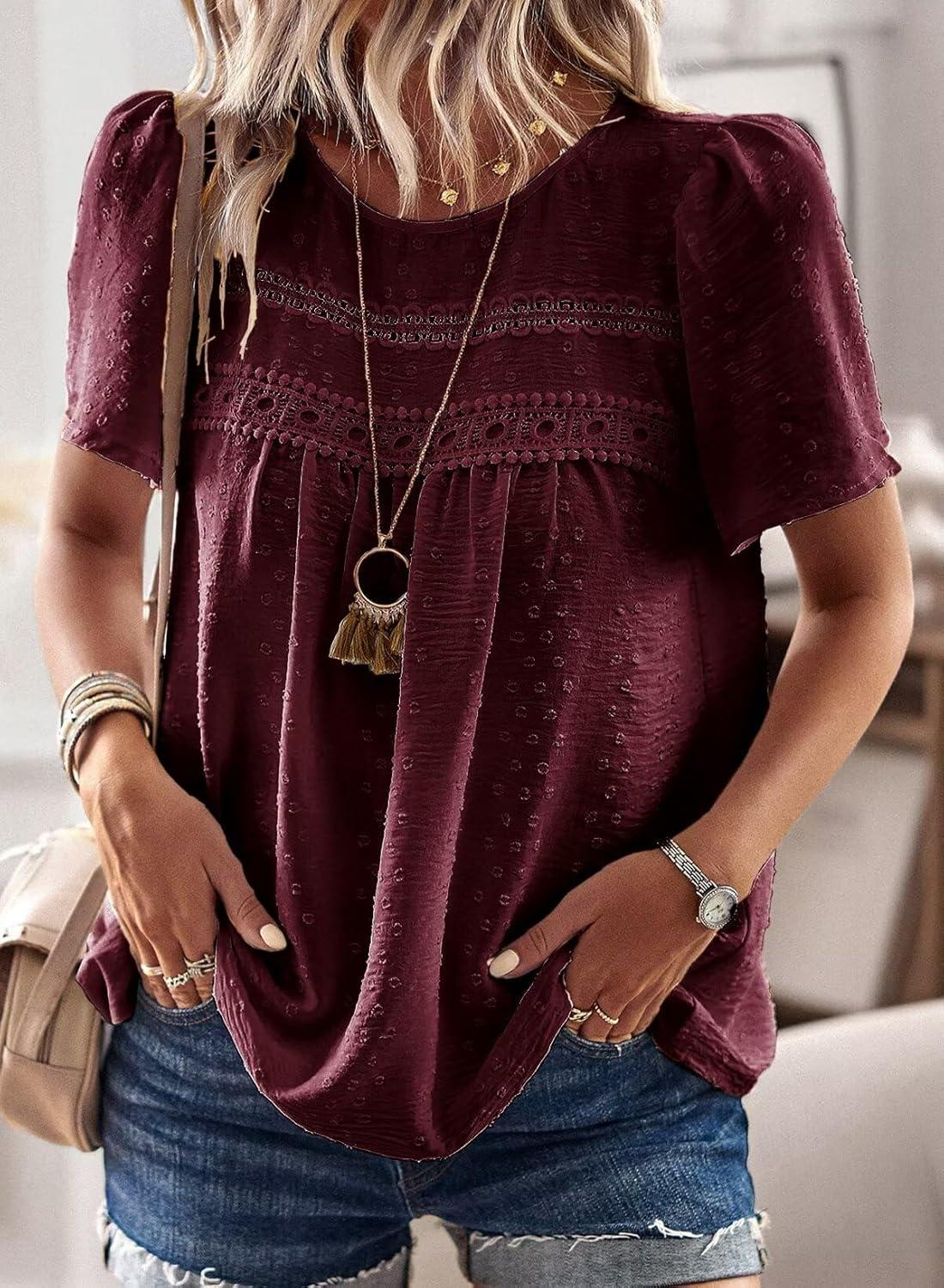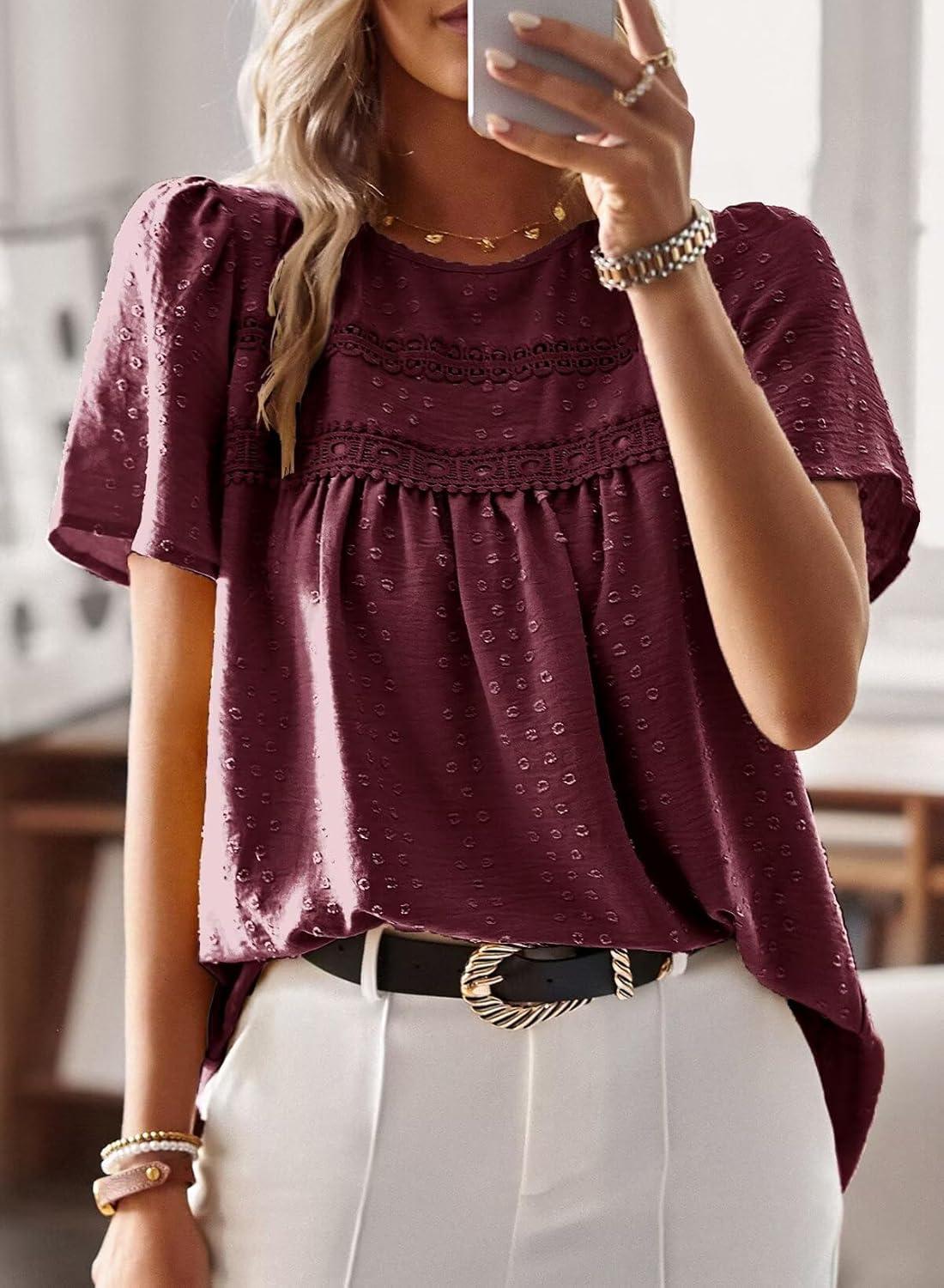 Womens Summer Tops Crewneck Short Sleeve Shirts Casual Chiffon Blouses Flowy Lace Hem Boho Clothing Trendy 2025(Mulberry)