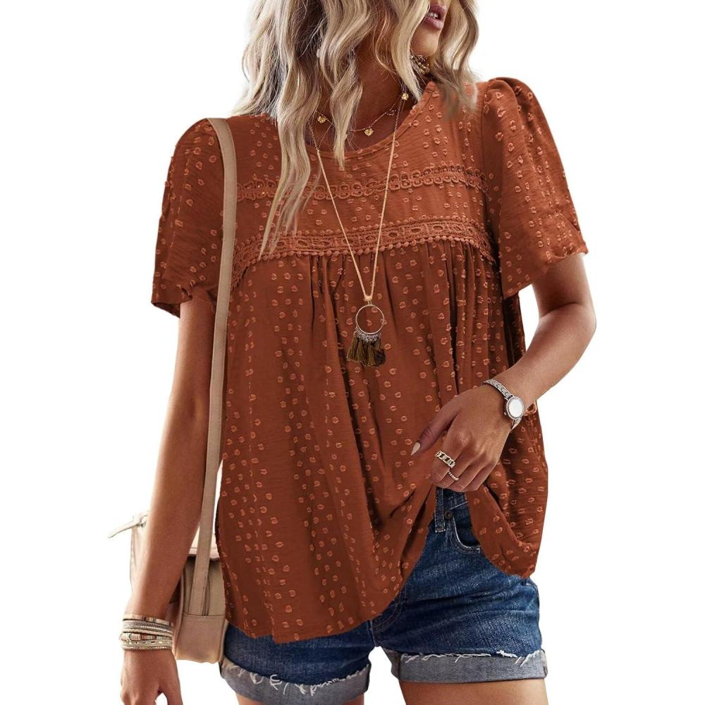 imageWomens Summer Tops Crewneck Short Sleeve Shirts Casual Chiffon Blouses Flowy Lace Hem Boho Clothing Trendy 2025Orange
