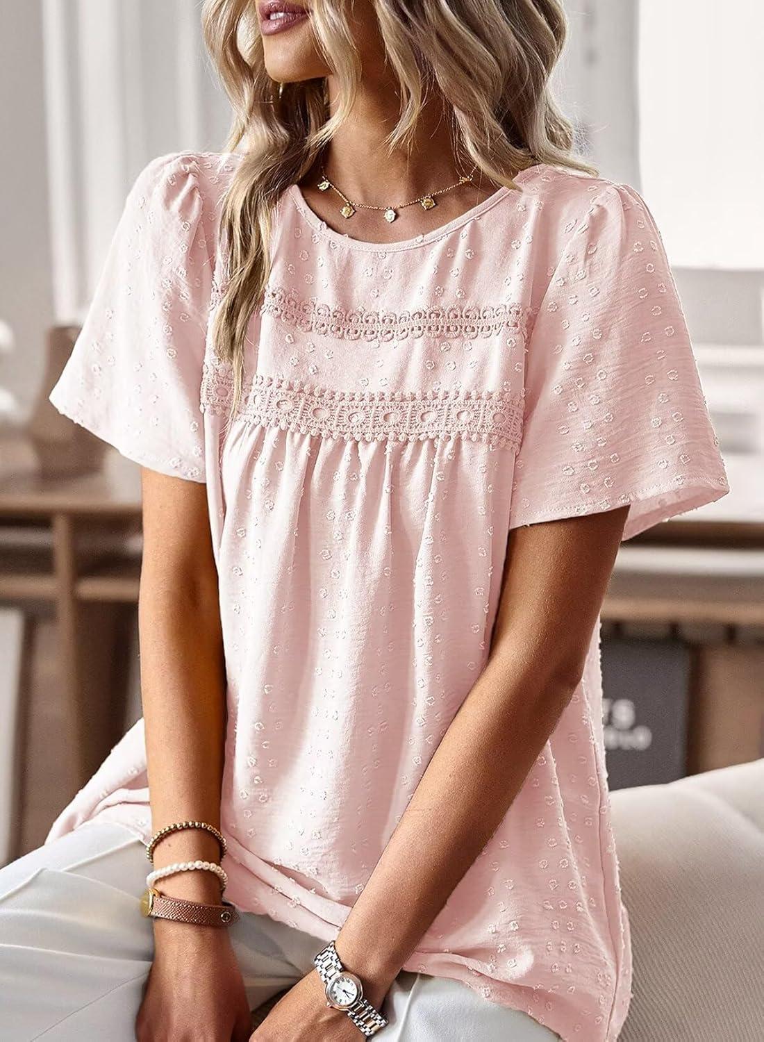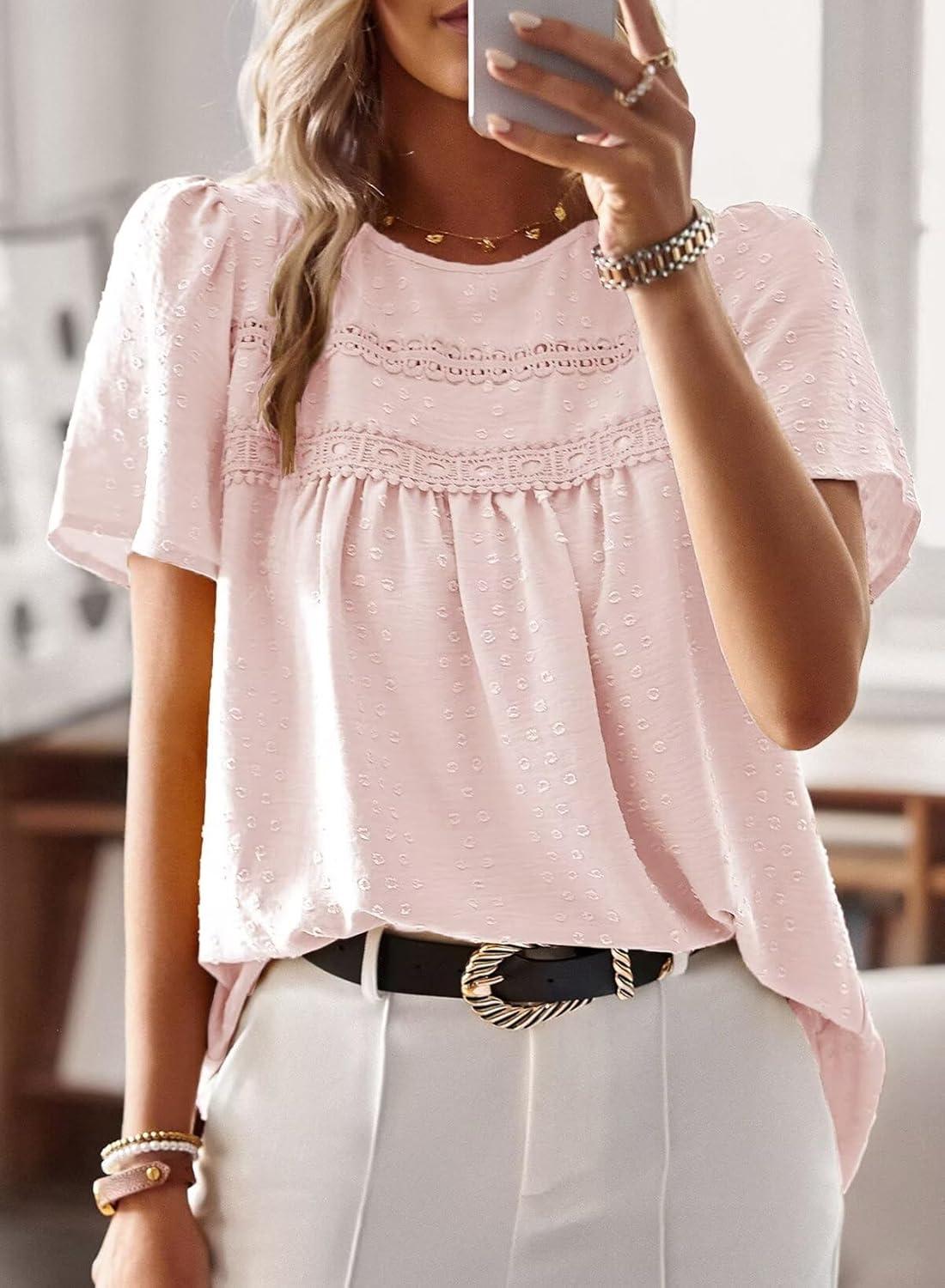 Womens Summer Tops Crewneck Short Sleeve Shirts Casual Chiffon Blouses Flowy Lace Hem Boho Clothing Trendy 2025(Pink)