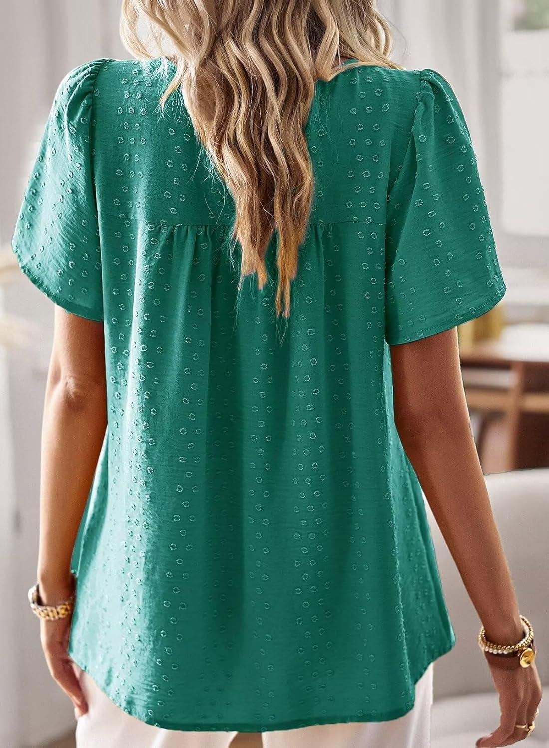 Womens Summer Tops Crewneck Short Sleeve Shirts Casual Chiffon Blouses Flowy Lace Hem Boho Clothing Trendy 2025(Turquoise)