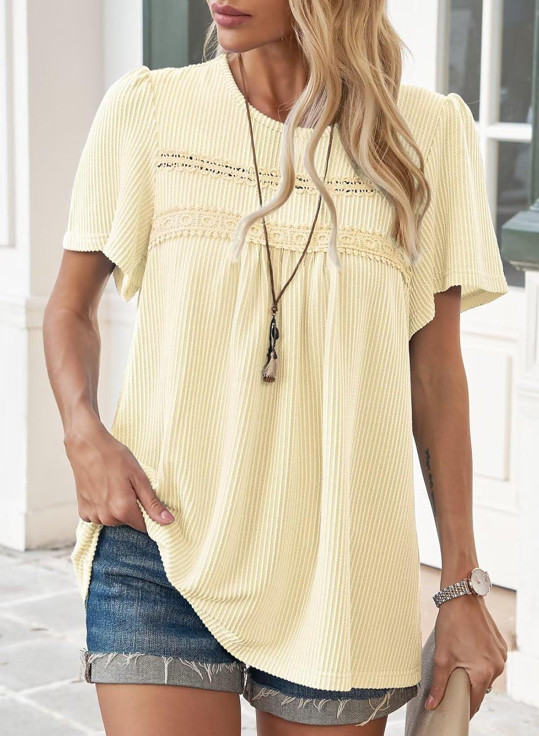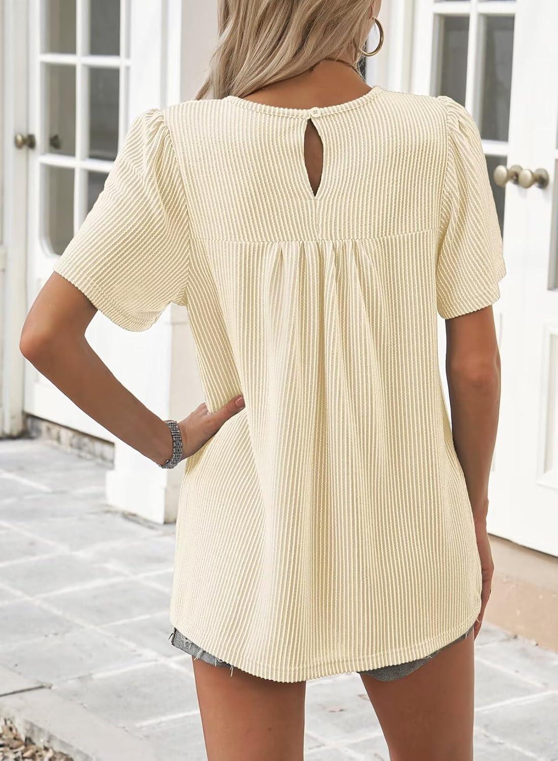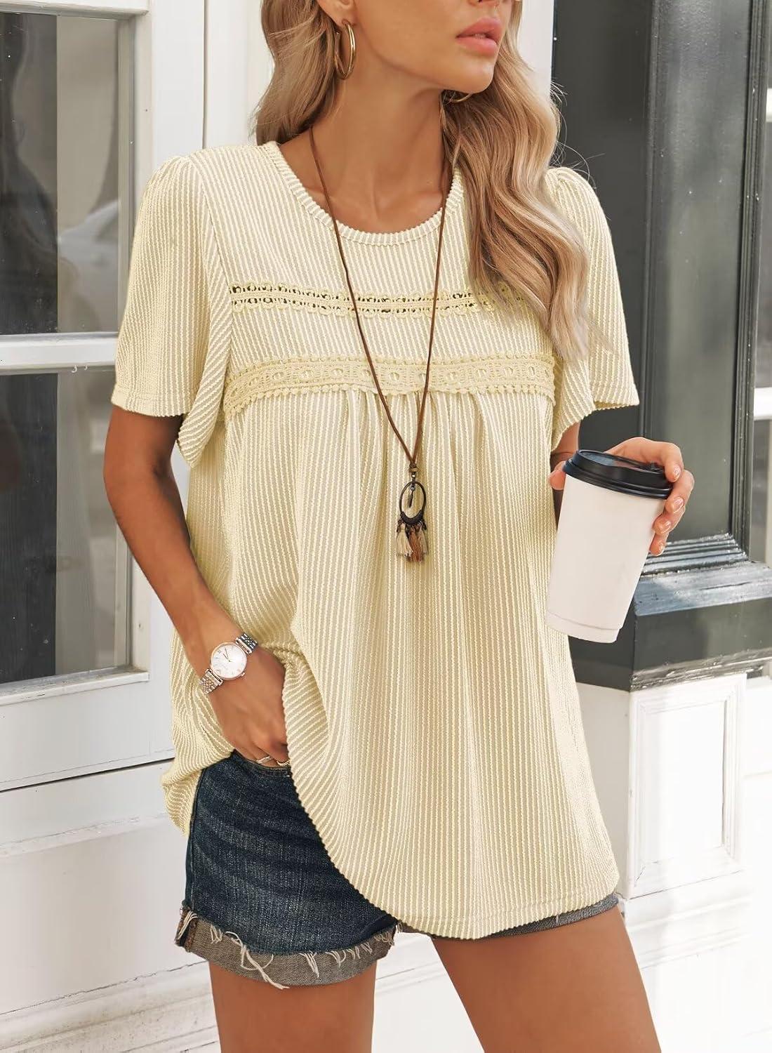 Womens Summer Tops Crewneck Short Sleeve Striped Shirts Casual Ribbed Blouses Flowy Hem Boho Clothing 2025(Apricot)