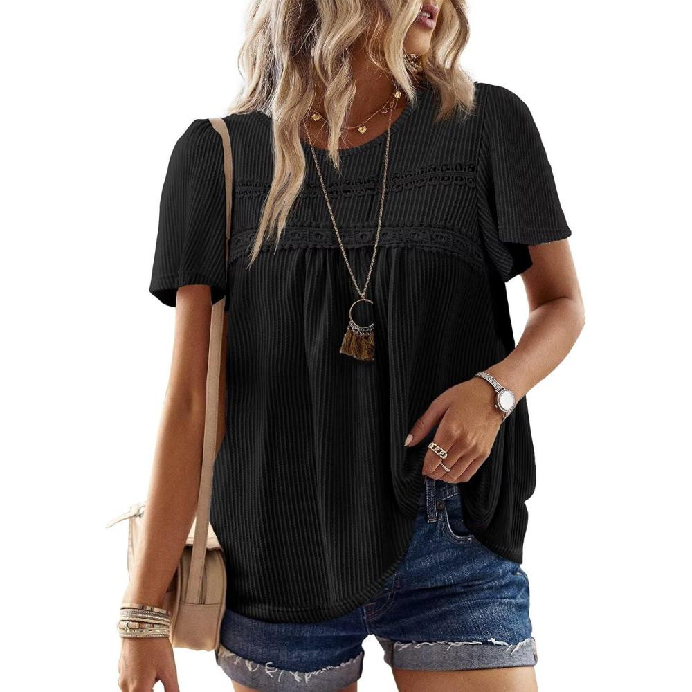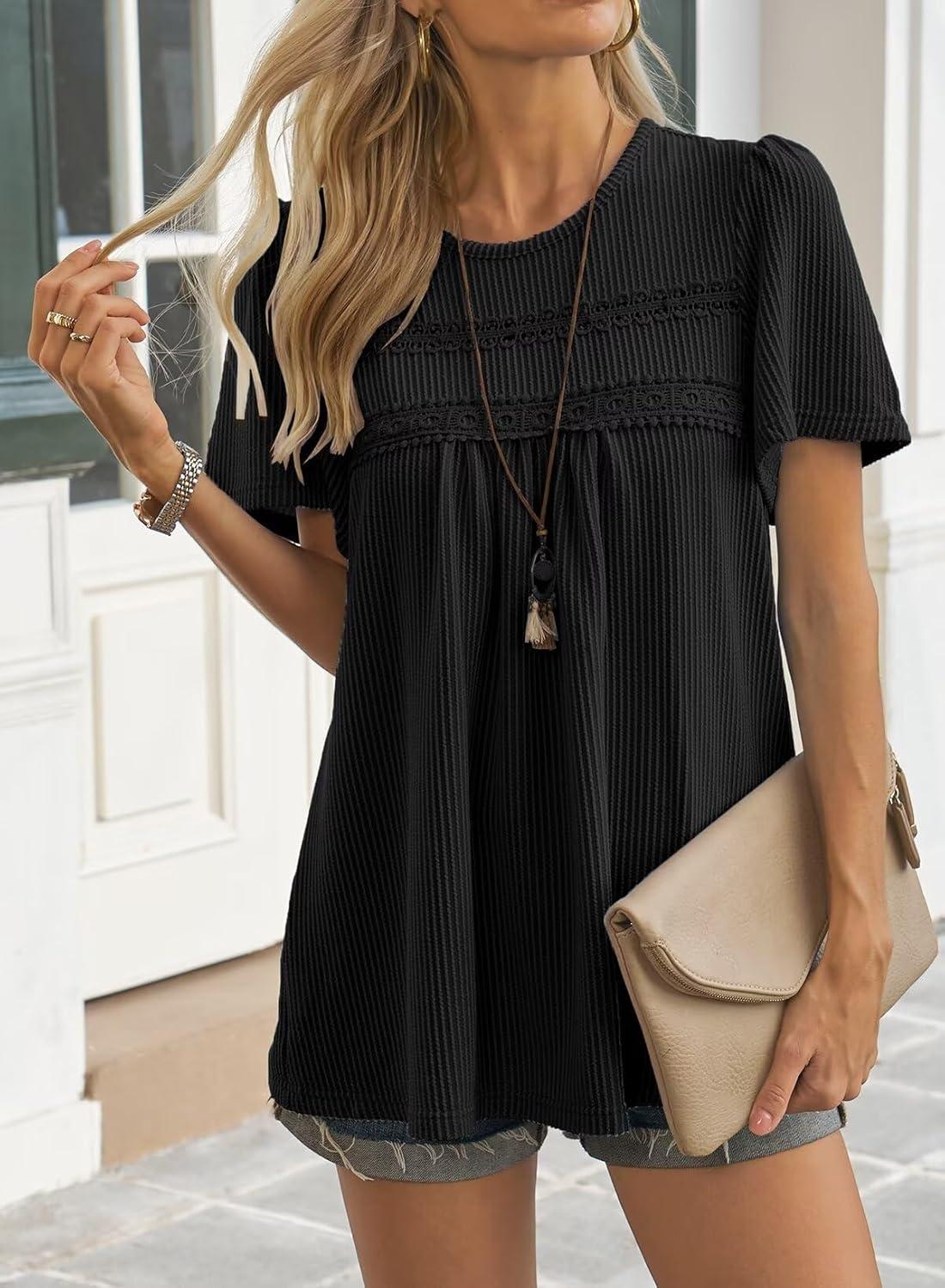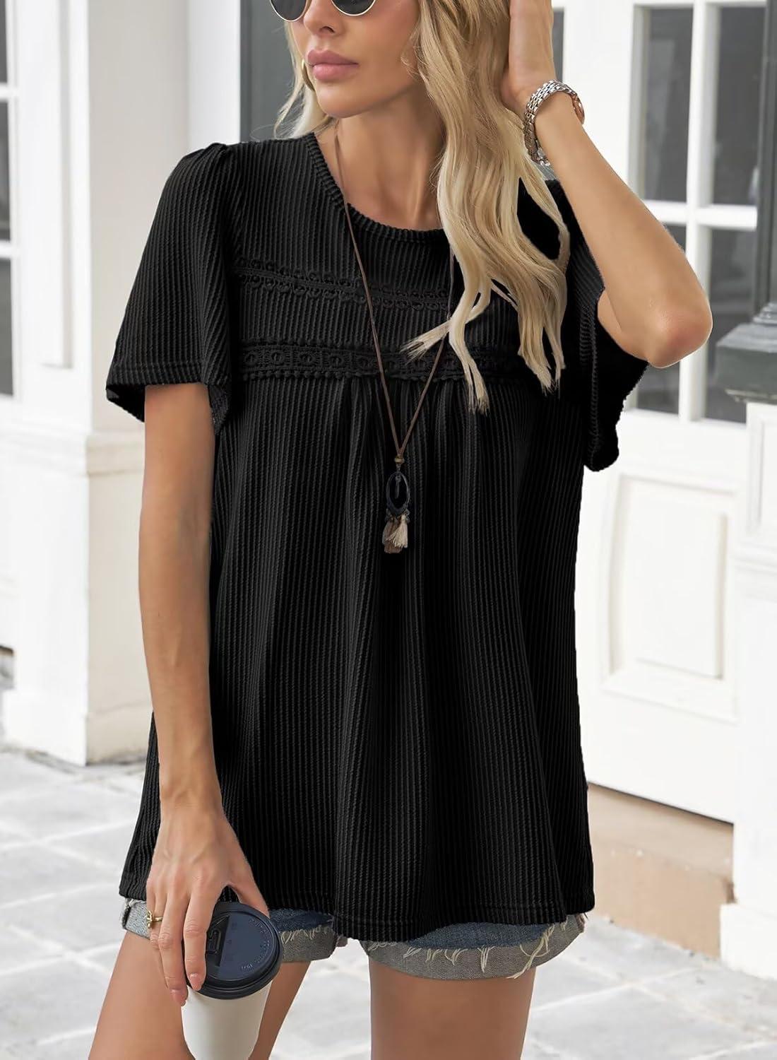 Womens Summer Tops Crewneck Short Sleeve Striped Shirts Casual Ribbed Blouses Flowy Hem Boho Clothing 2025(Black)