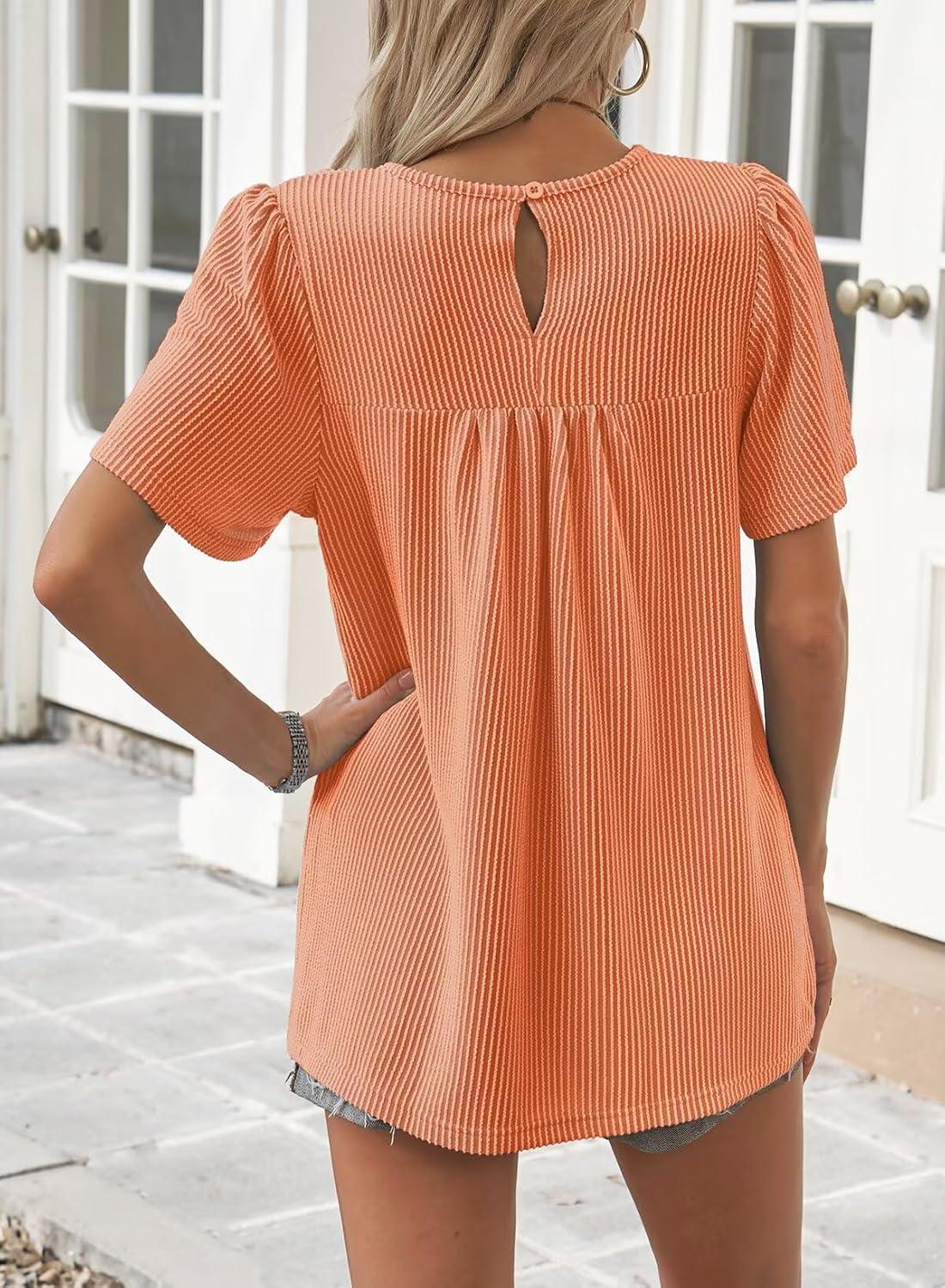 Womens Summer Tops Crewneck Short Sleeve Striped Shirts Casual Ribbed Blouses Flowy Hem Boho Clothing 2025(Bright Orange)
