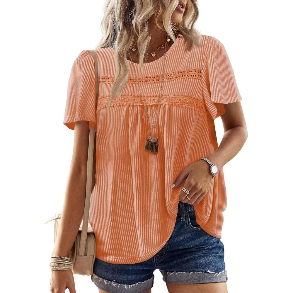 imageWomens Summer Tops Crewneck Short Sleeve Striped Shirts Casual Ribbed Blouses Flowy Hem Boho Clothing 2025Bright Orange