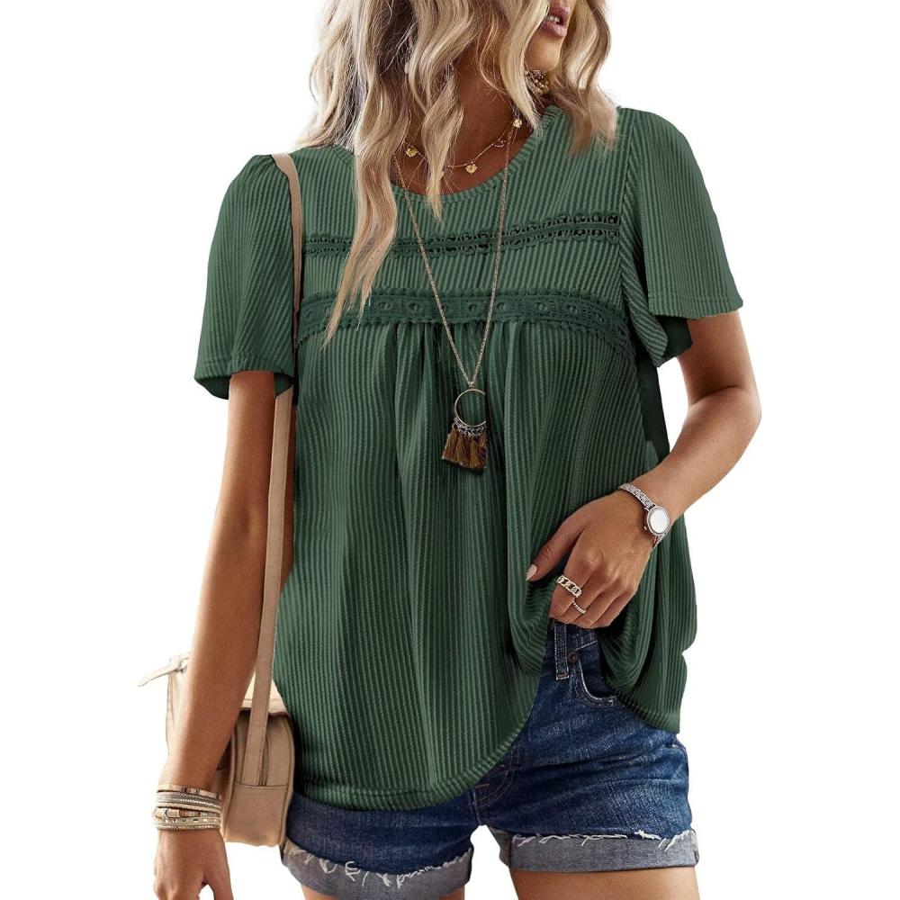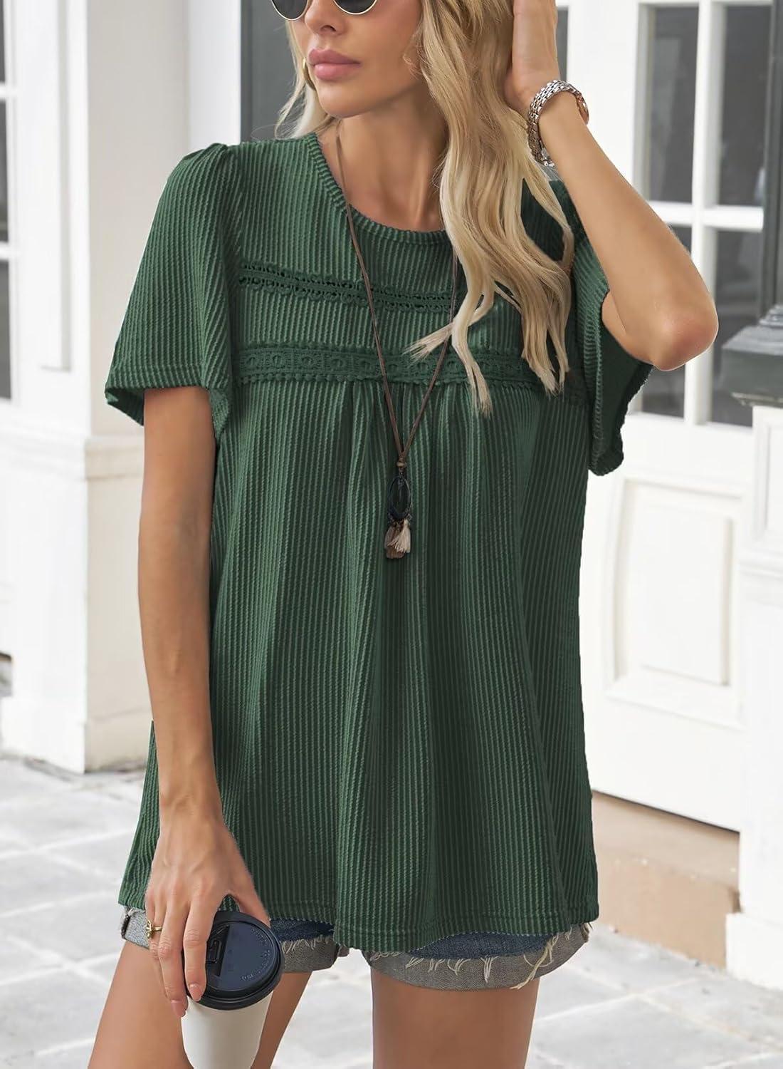 Womens Summer Tops Crewneck Short Sleeve Striped Shirts Casual Ribbed Blouses Flowy Hem Boho Clothing 2025(Dark Green)