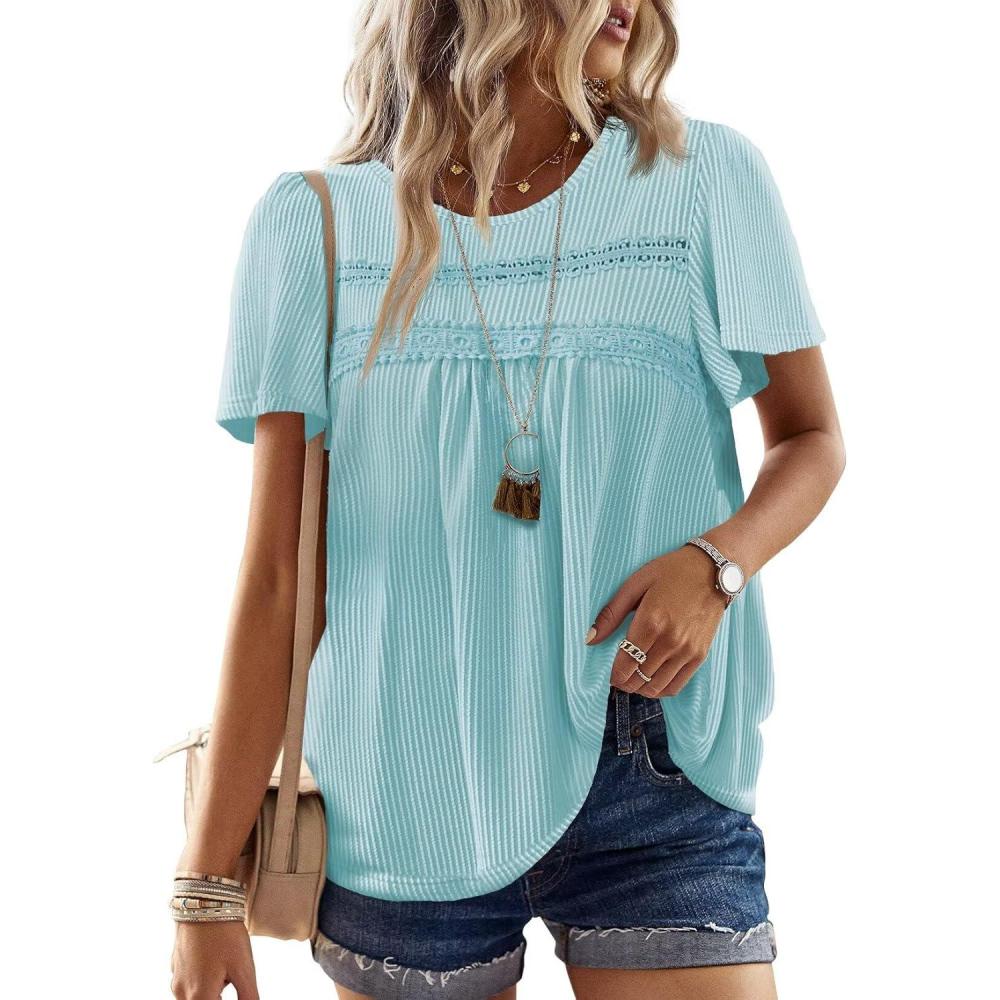 Womens Summer Tops Crewneck Short Sleeve Striped Shirts Casual Ribbed Blouses Flowy Hem Boho Clothing 2025(Light Teal)