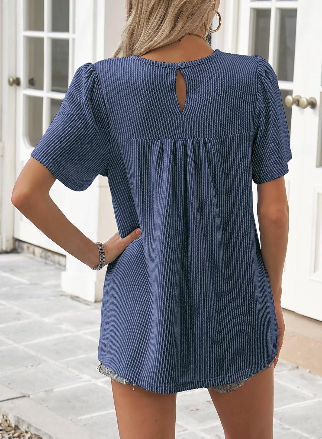 Womens Summer Tops Crewneck Short Sleeve Striped Shirts Casual Ribbed Blouses Flowy Hem Boho Clothing 2025(Navy Blue)