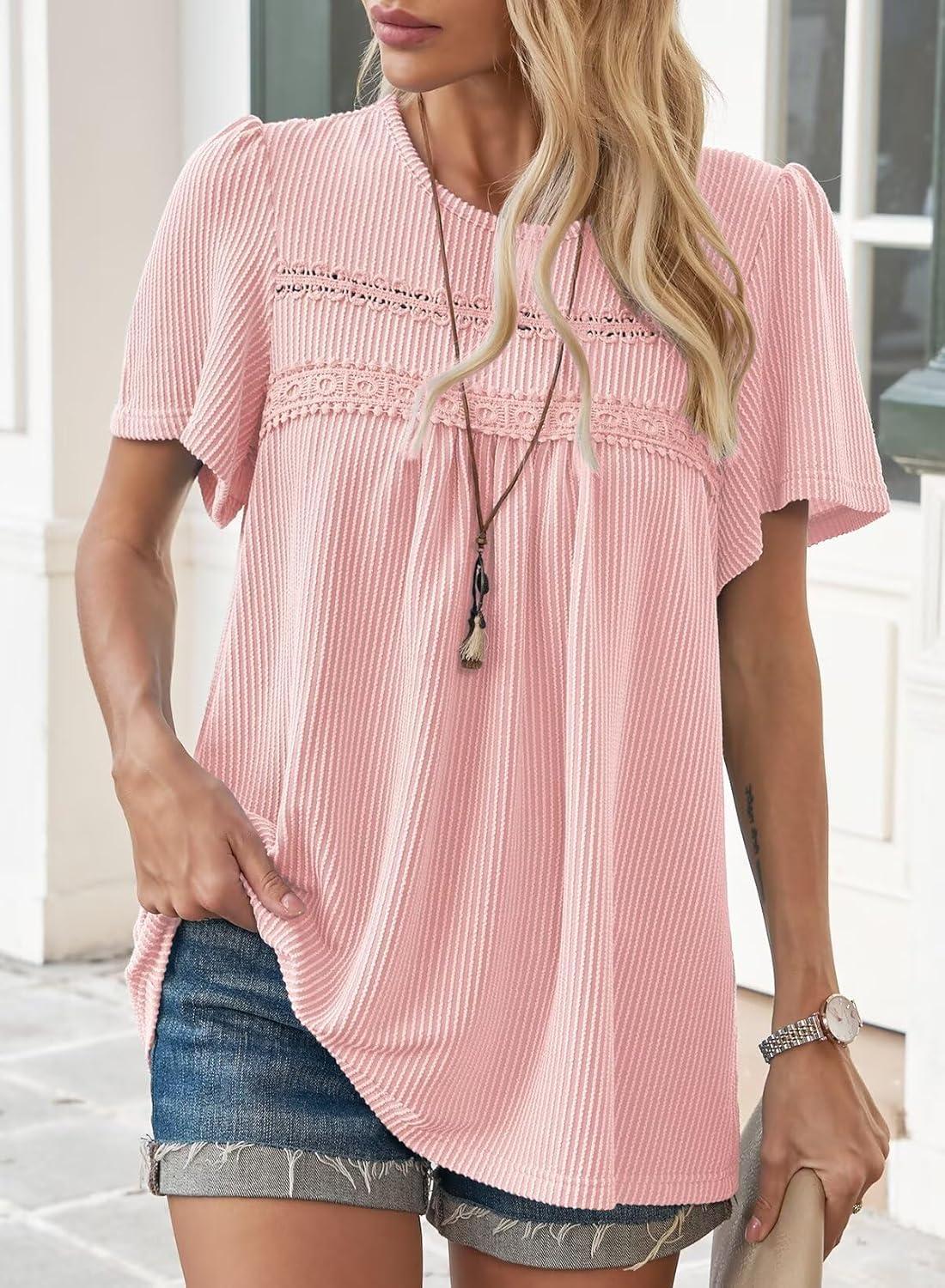 Womens Summer Tops Crewneck Short Sleeve Striped Shirts Casual Ribbed Blouses Flowy Hem Boho Clothing 2025(Pink)
