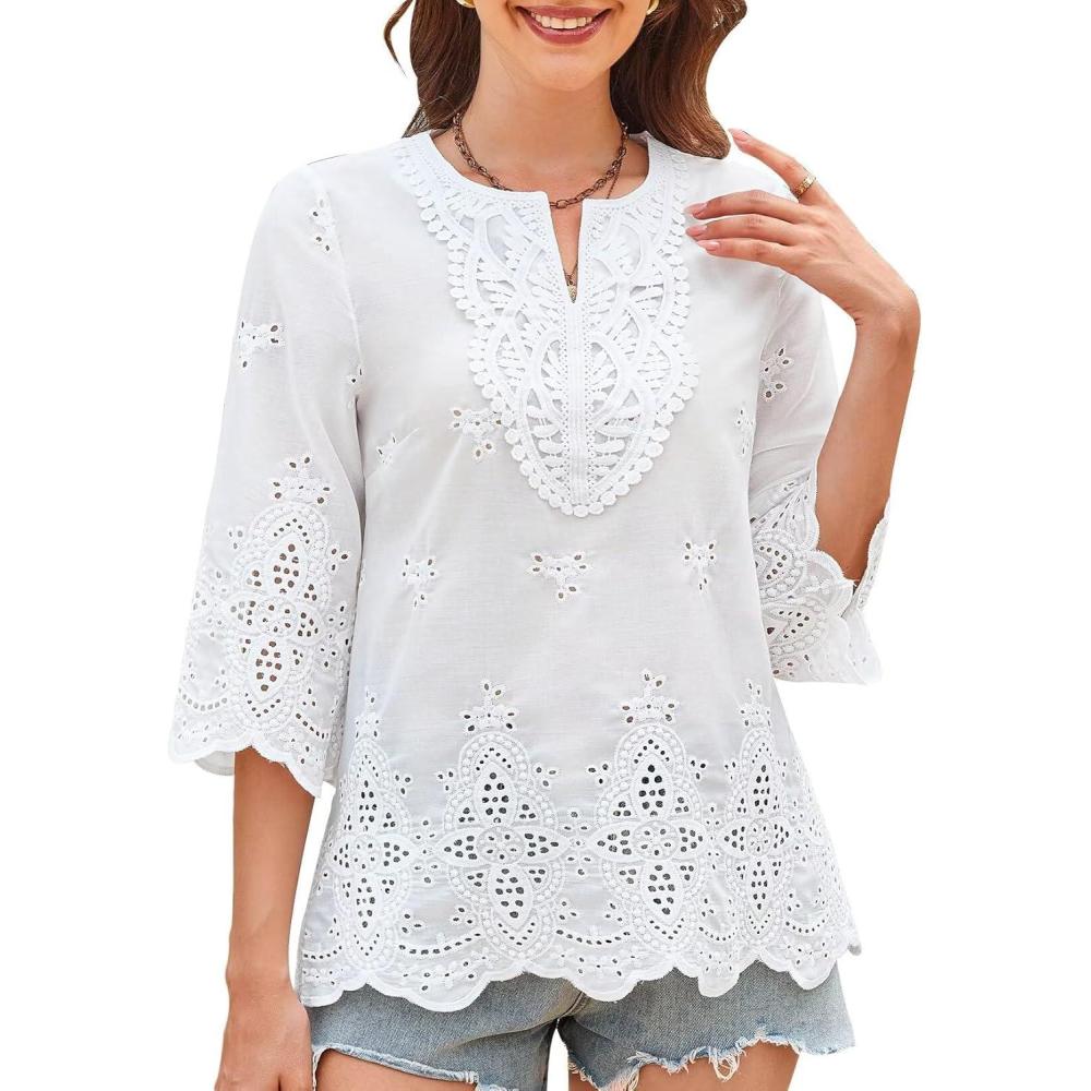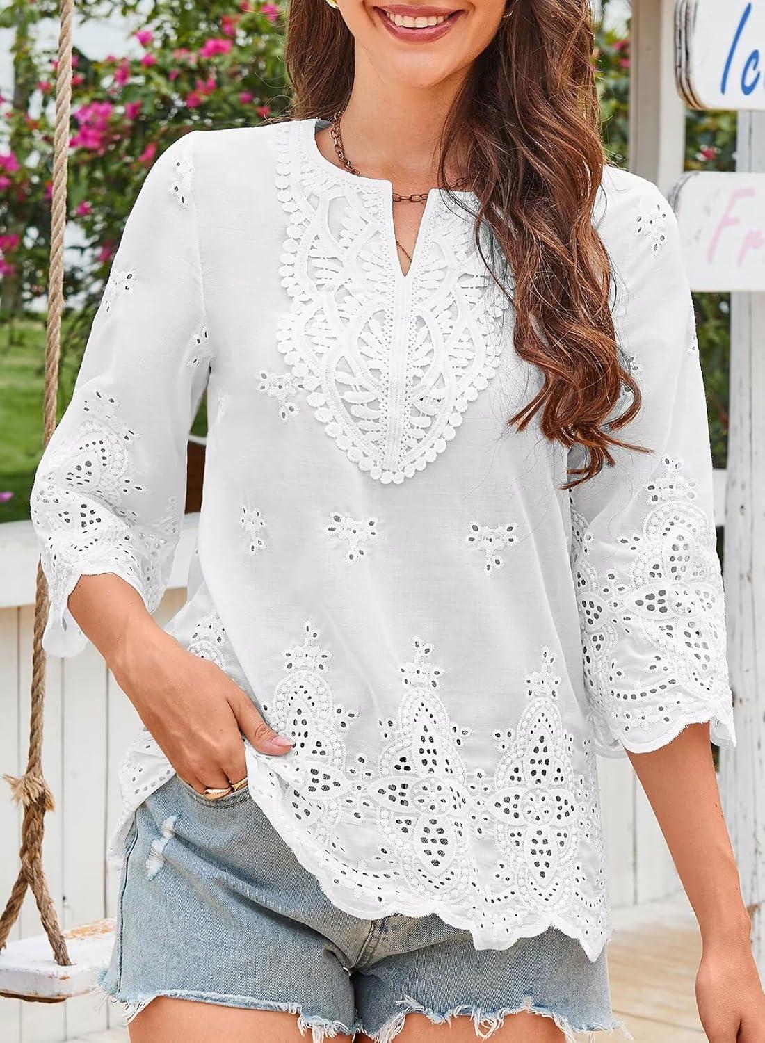 Womens Tops 3/4 Length Sleeve Eyelet Blouse Peasant Flowy Boho Top Hollow Out Embroidered Notch V Neck Shirts(White)