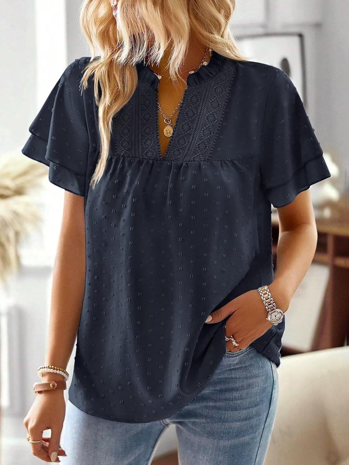 Womens Tops Butterfly Sleeve V Neck Blouses for Women Dressy Casual Flowy Swiss Dot Ruffle Short Sleeve Shirts(Navy Blue)