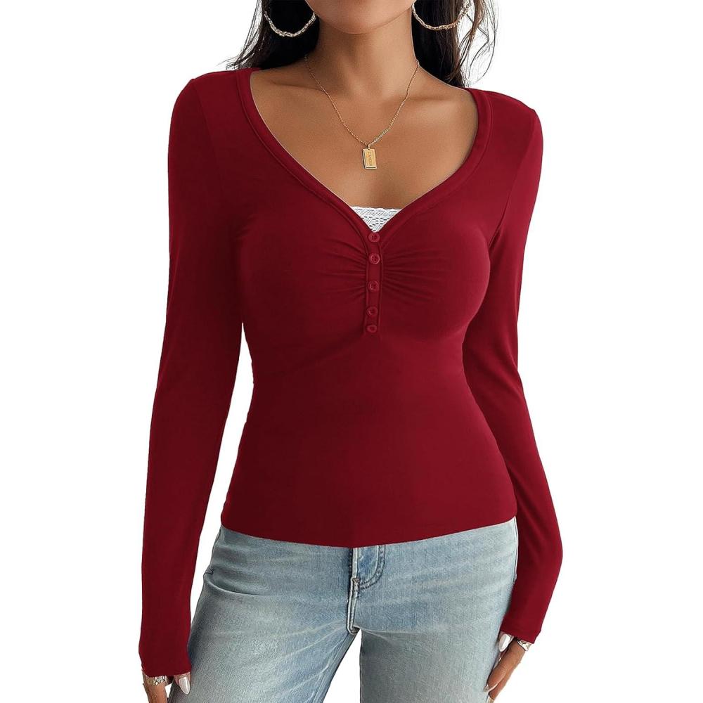 Chic Lace Detail: The delicate lace panel at the chest adds a sophisticated touch, enhancing the overall aesthetic of the tunic. This exquisite detail not only draws the eye but also creates a stunning contrast against the solid color, elevating the garment’s charm and making it a standout piece in your wardrobe.