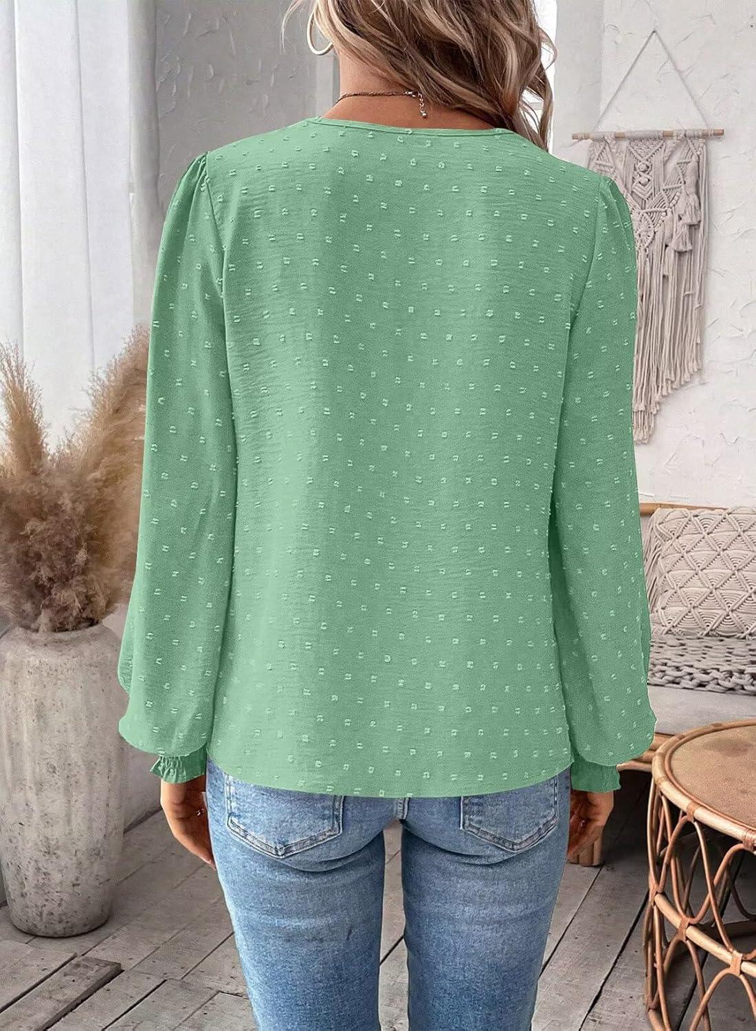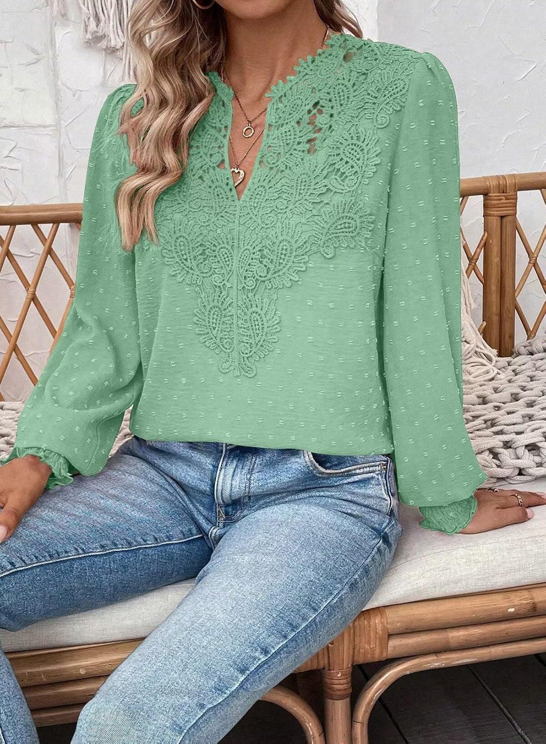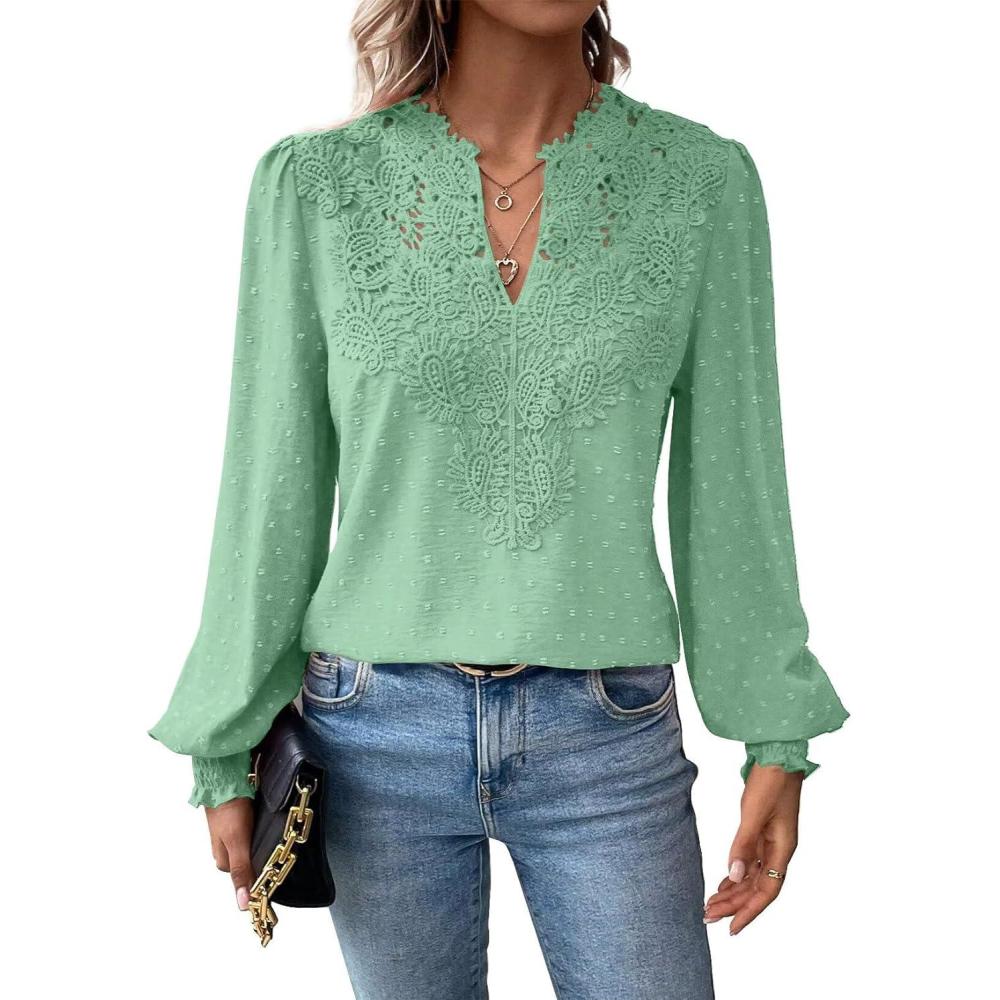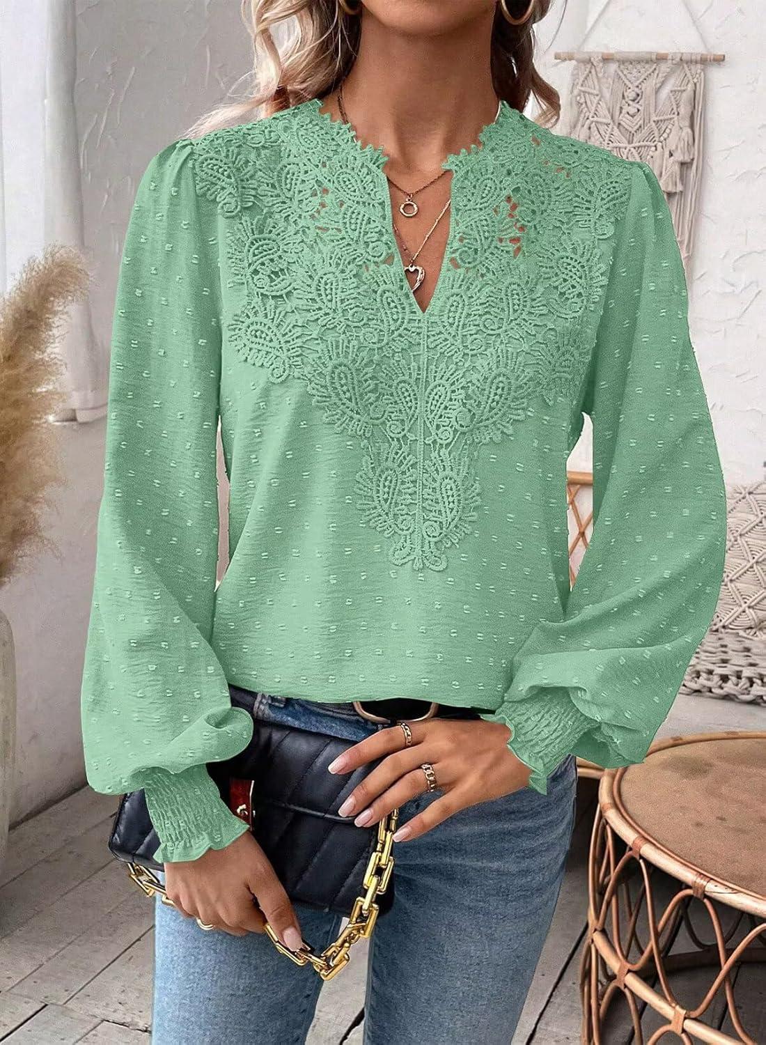 Womens Tops Swiss Dot Boho Long Sleeve Shirts V Neck Casual Chiffon Blouses Flowy Lace Hem Cute Clothing Trendy 2026(Sage Green)