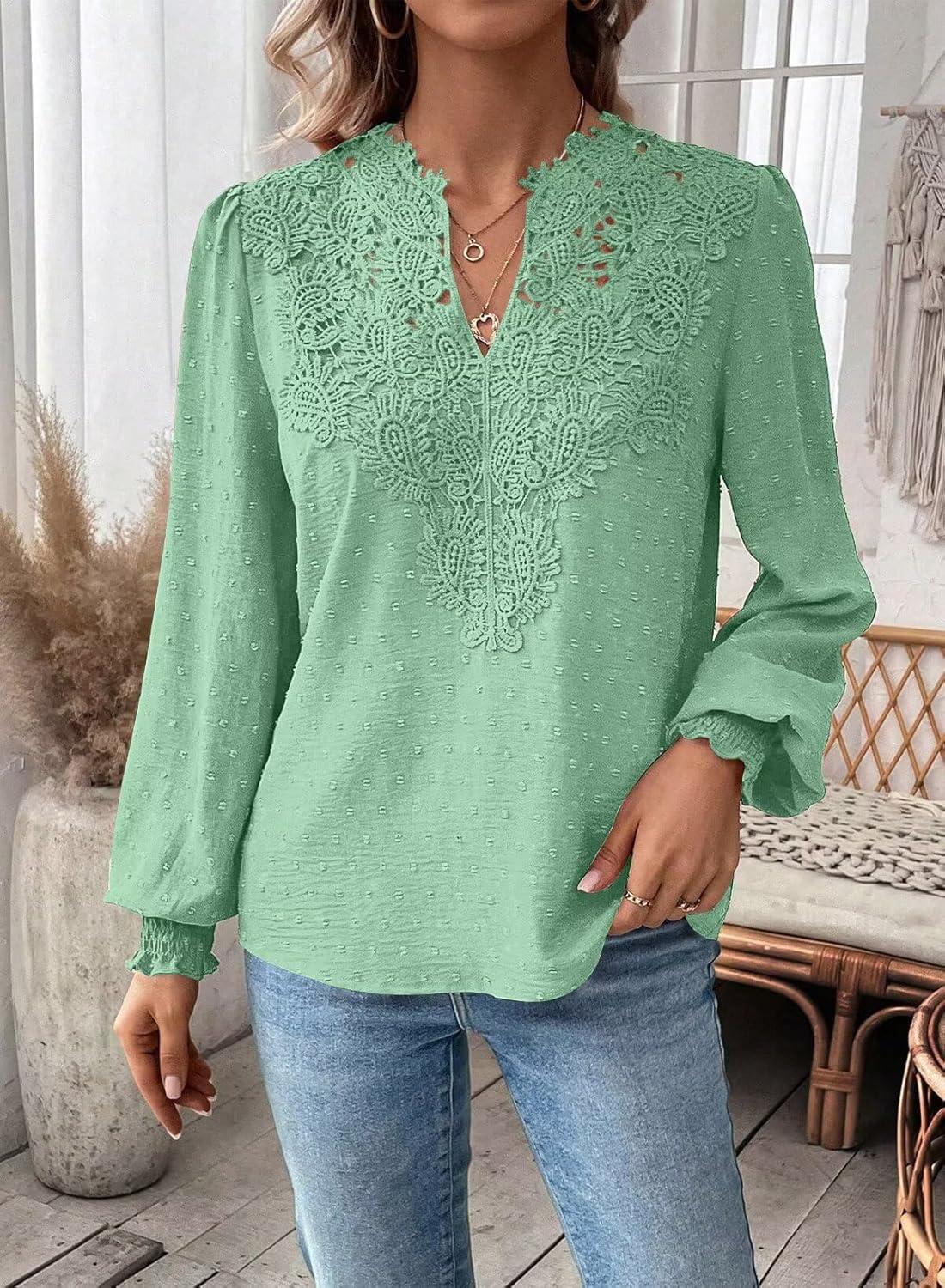 Womens Tops Swiss Dot Boho Long Sleeve Shirts V Neck Casual Chiffon Blouses Flowy Lace Hem Cute Clothing Trendy 2026(Cyan)