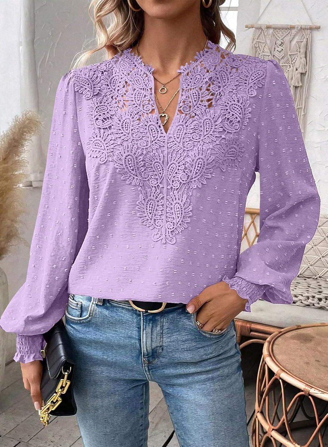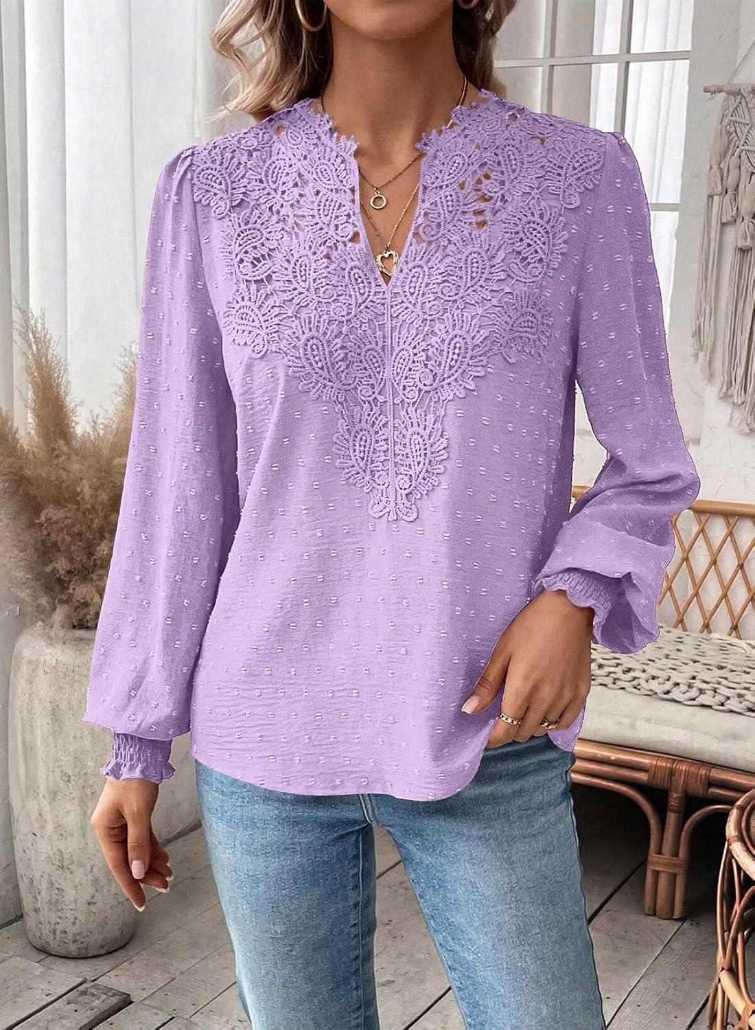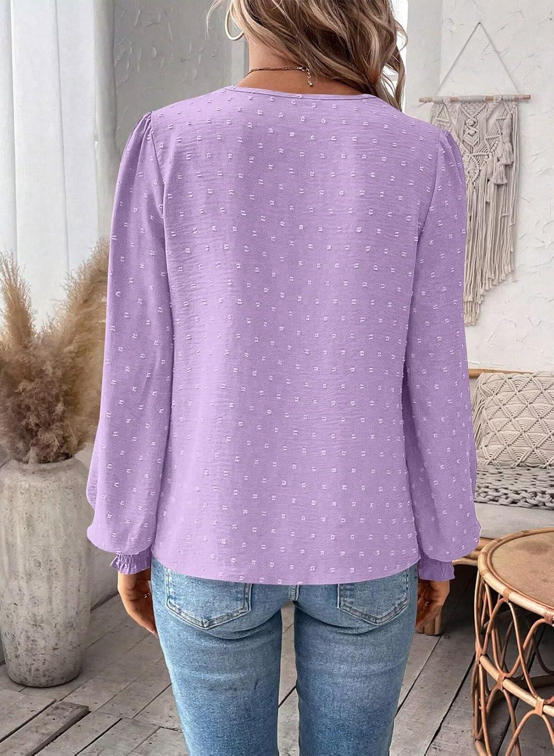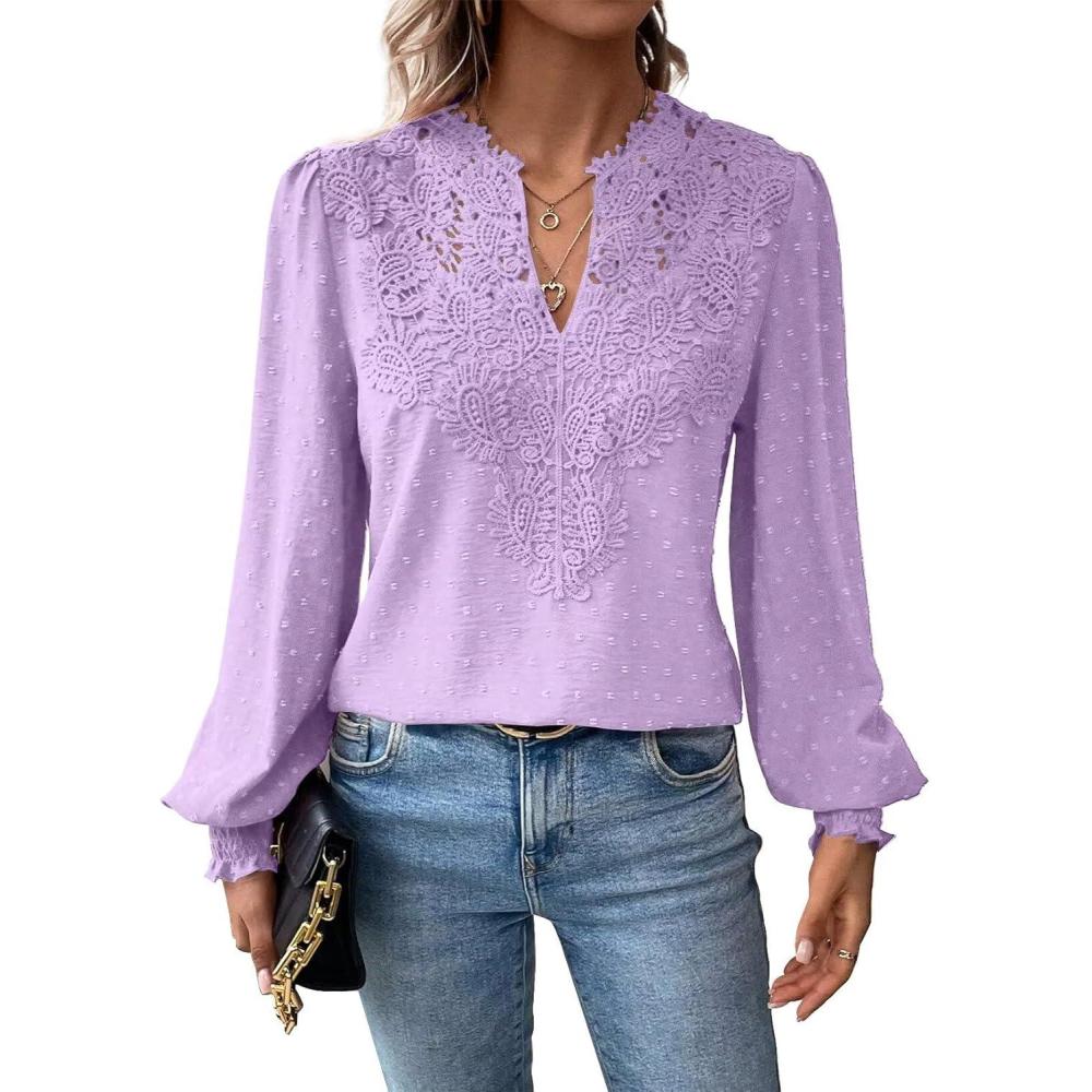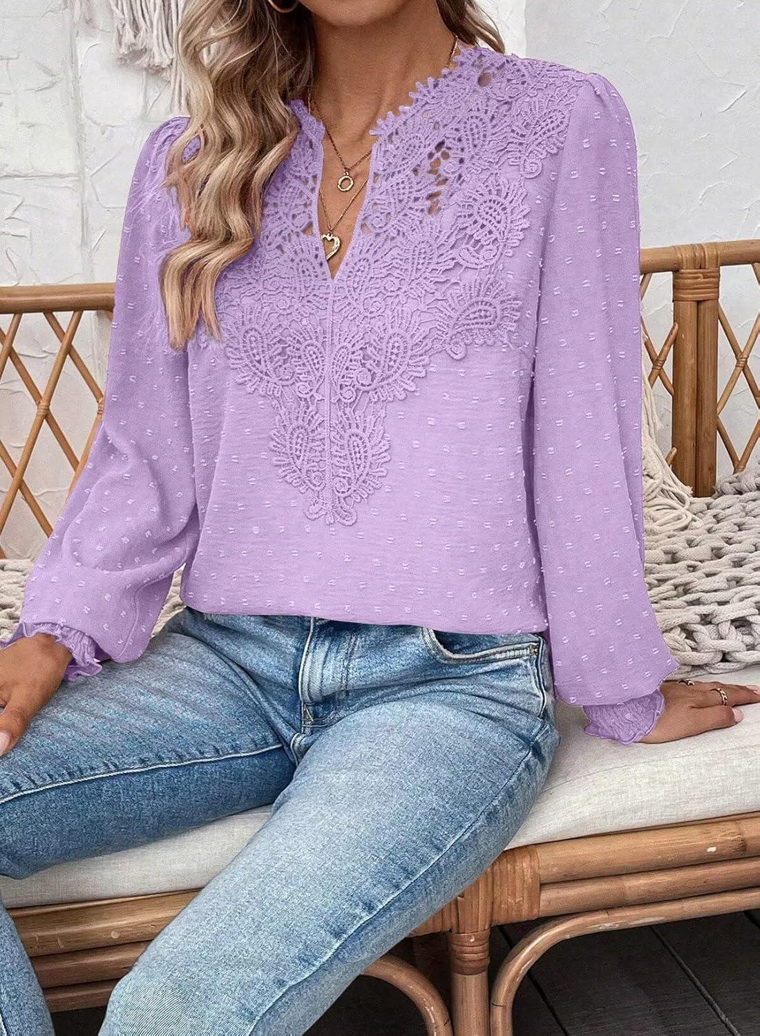 Womens Tops Swiss Dot Boho Long Sleeve Shirts V Neck Casual Chiffon Blouses Flowy Lace Hem Cute Clothing Trendy 2026(Purple)
